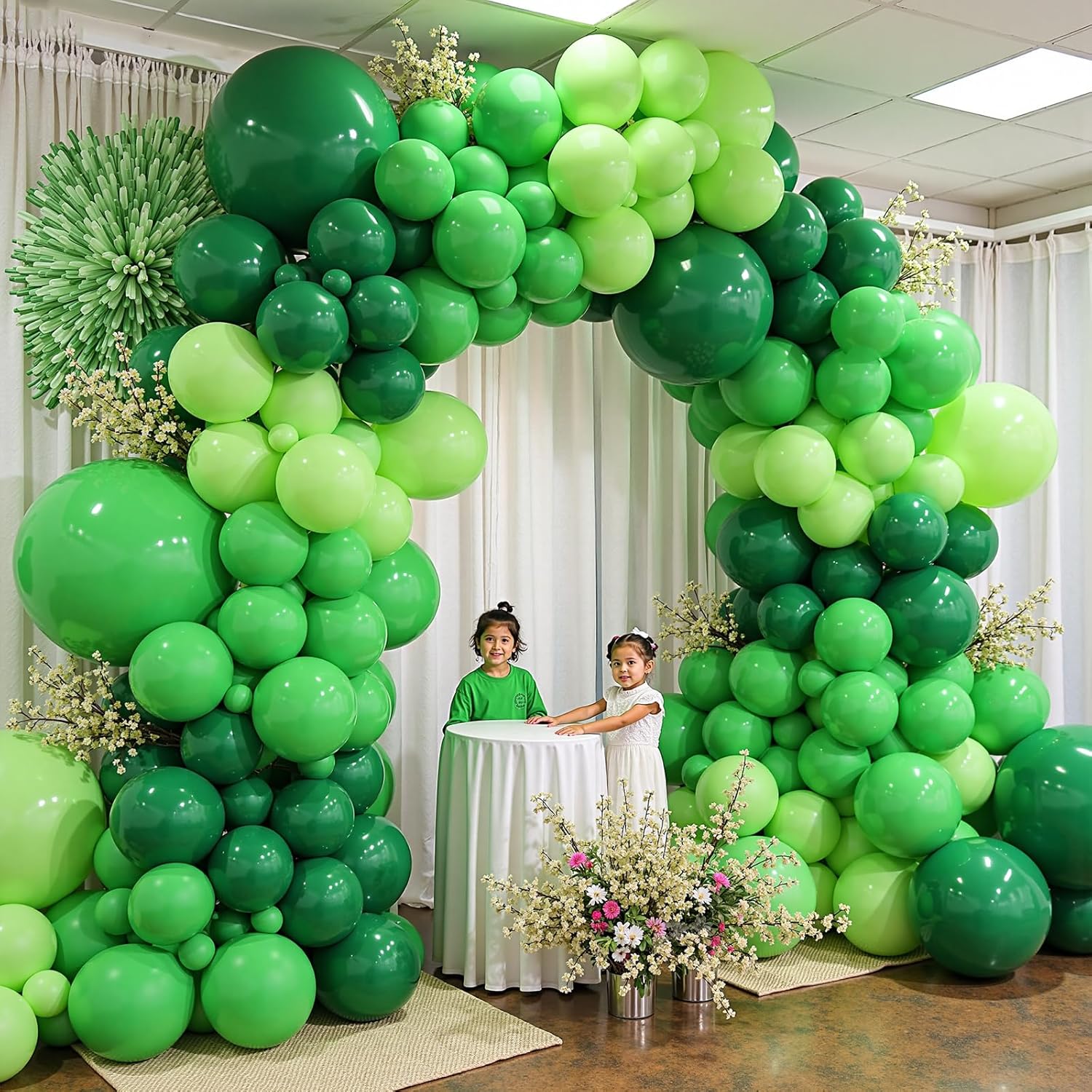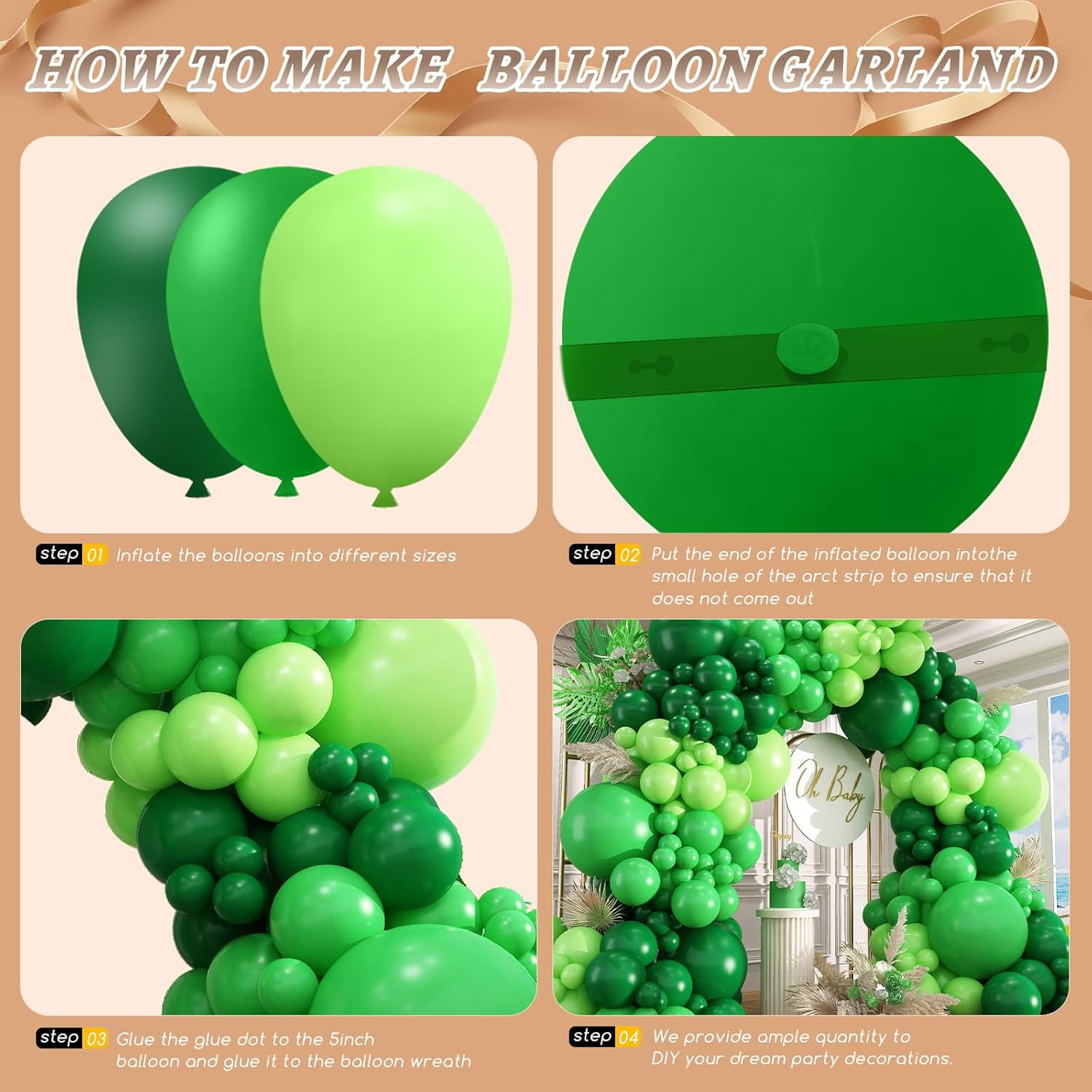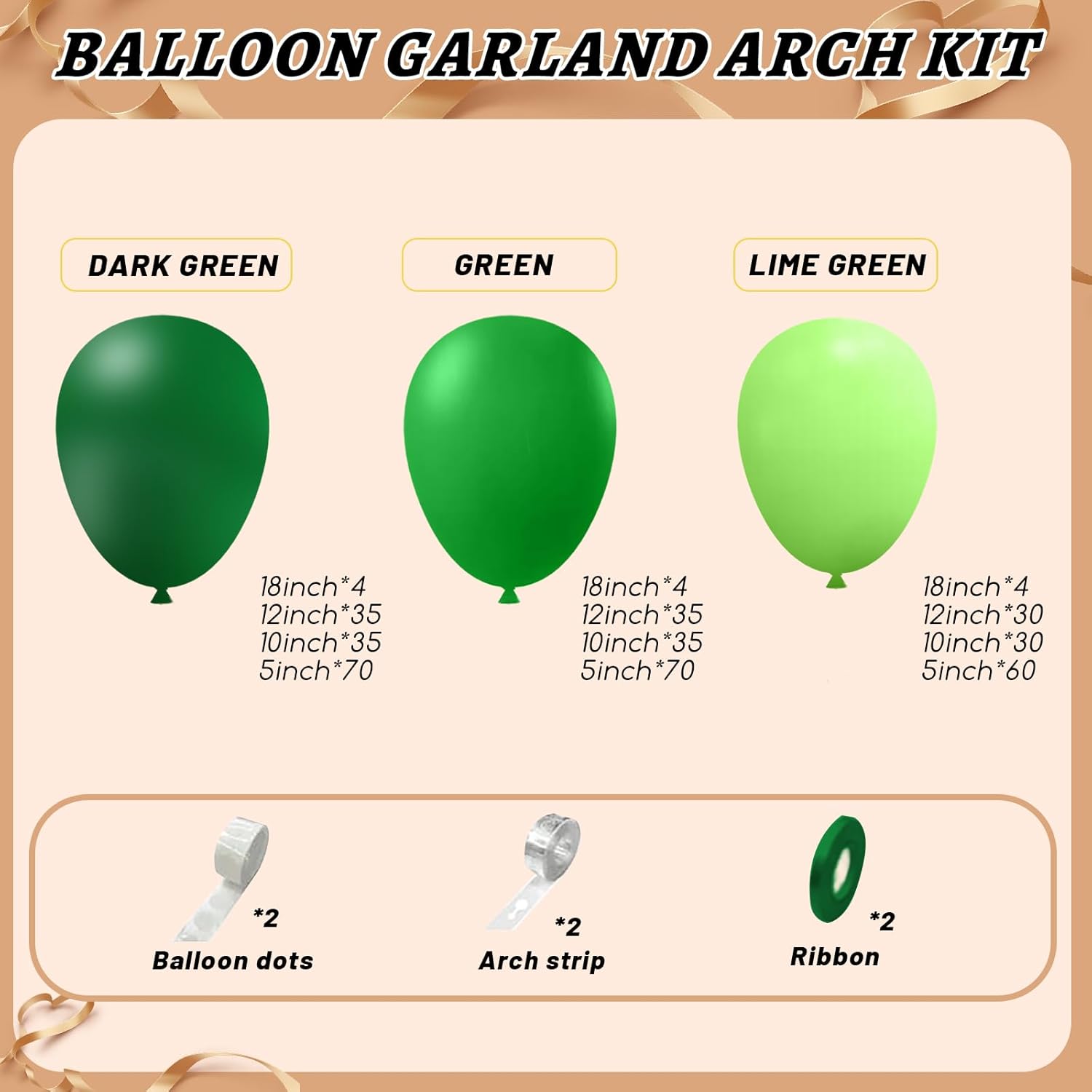 • Package List :green balloon arch kit includes 18" Lime Green/ Dark Green/Green balloons(12 pcs), 12" Lime Green/Dark Green/Green balloons(100 pcs), 10"Lime Green/ Dark Green/Green balloons(100 pcs), 5" Lime Green/ Dark Green/Green balloons(100pcs),glue dotsx200, ribbonx2, decorative stripx2. plenty in quantity.