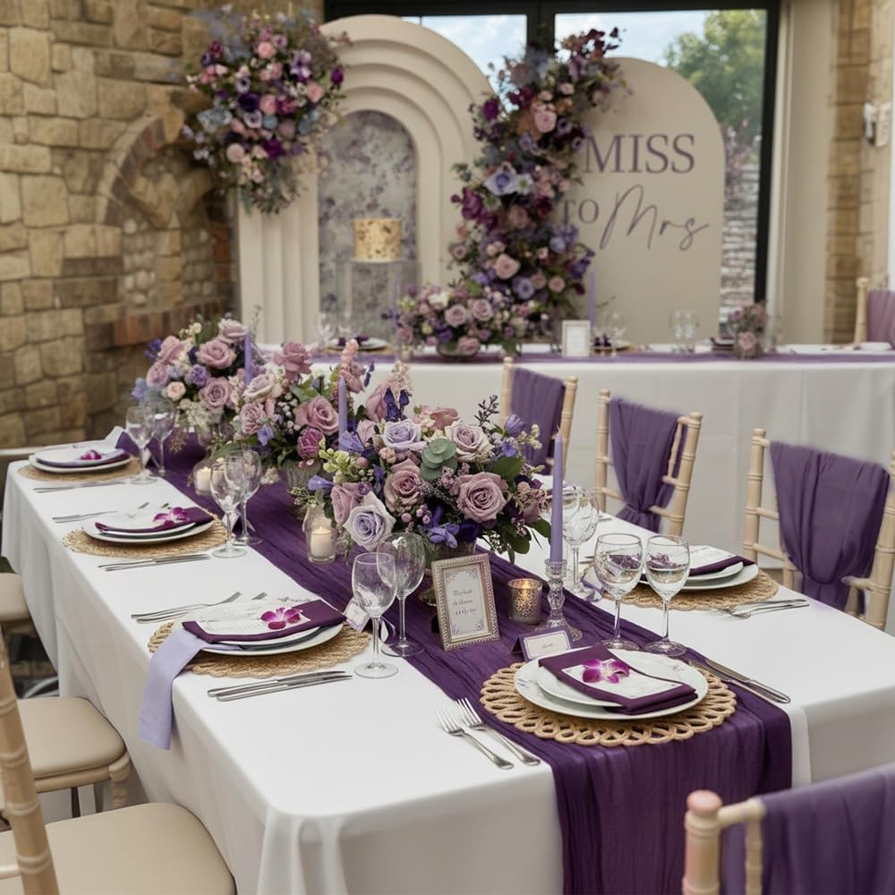 • 🍇【Versatile Purple Cheese Cloth Table Runner】This boho-style plum purple table runners 6 pack perfect for any event, including weddings, banquets, bridal or baby showers, wedding arches, receptions, candy buffets, ceremonies, and many more special events&holidays.It can also be applied to spicing up home curtains, fireplace, sofa, dresser runner and any other furniture that needs a romantic touch. It's an excellent addition to any event decoration and gives a touch of elegance to your overall decor that is both romantic and charming.