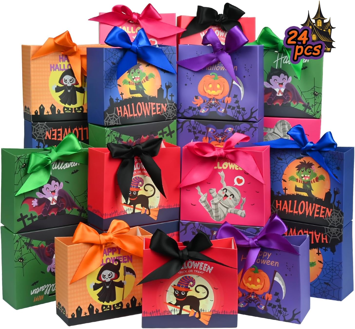 24PCS Halloween Goodies Bags, Trick or Treat Candy Gift Paper Bags Bulk with Ribbons, Halloween Treat Boxes for Kid, Party Favor, Classroom Exchange, Home Decoration 4.5 x 3.9 x 1.7 Inches
