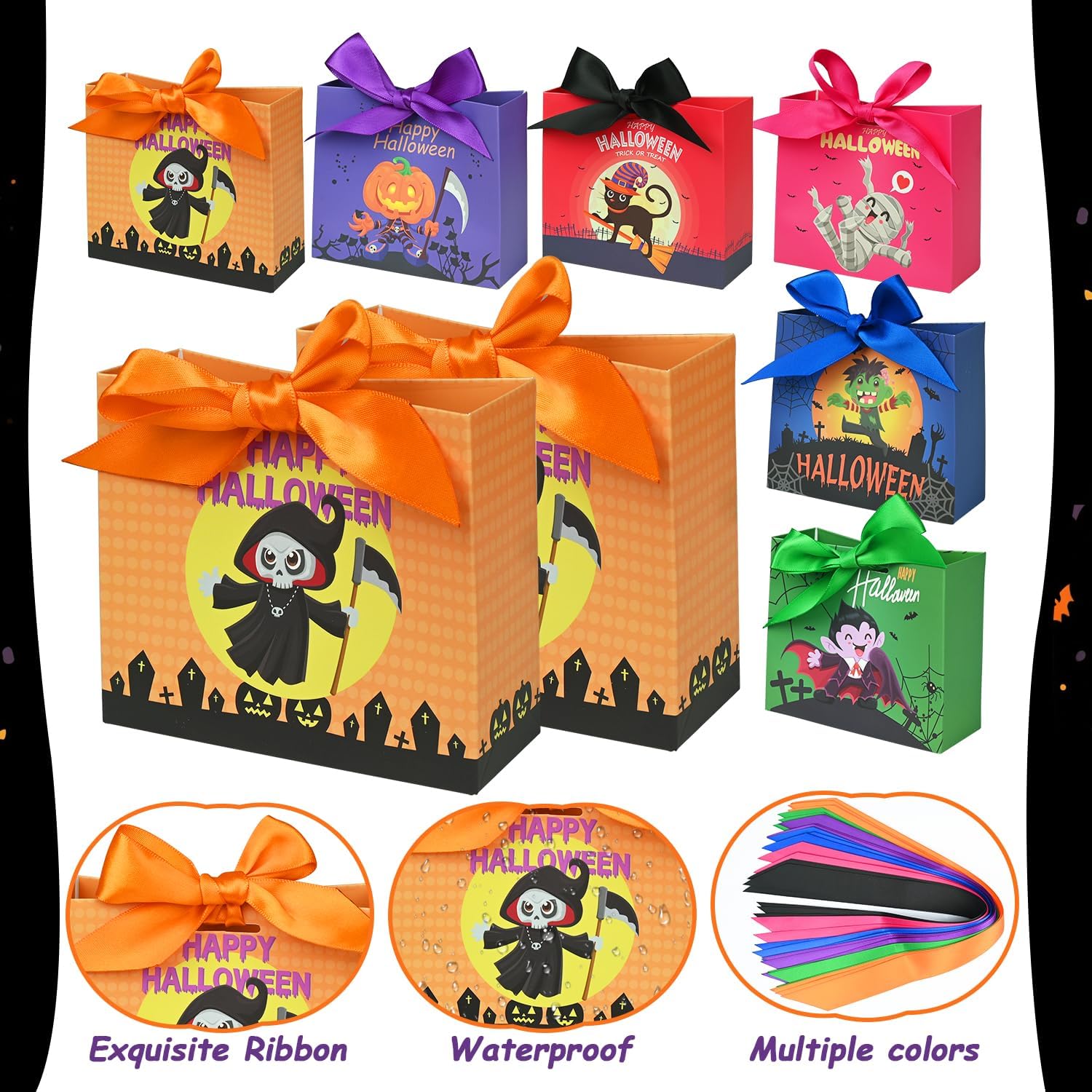 • 【Packaging size】 Each Halloween trick or treat bags measures 4.5x3.9x1.7inches, they are just the right size to hold candies, cookies, chocolates, cards, small toys and other items. Perfect for Halloween holiday gift packaging.