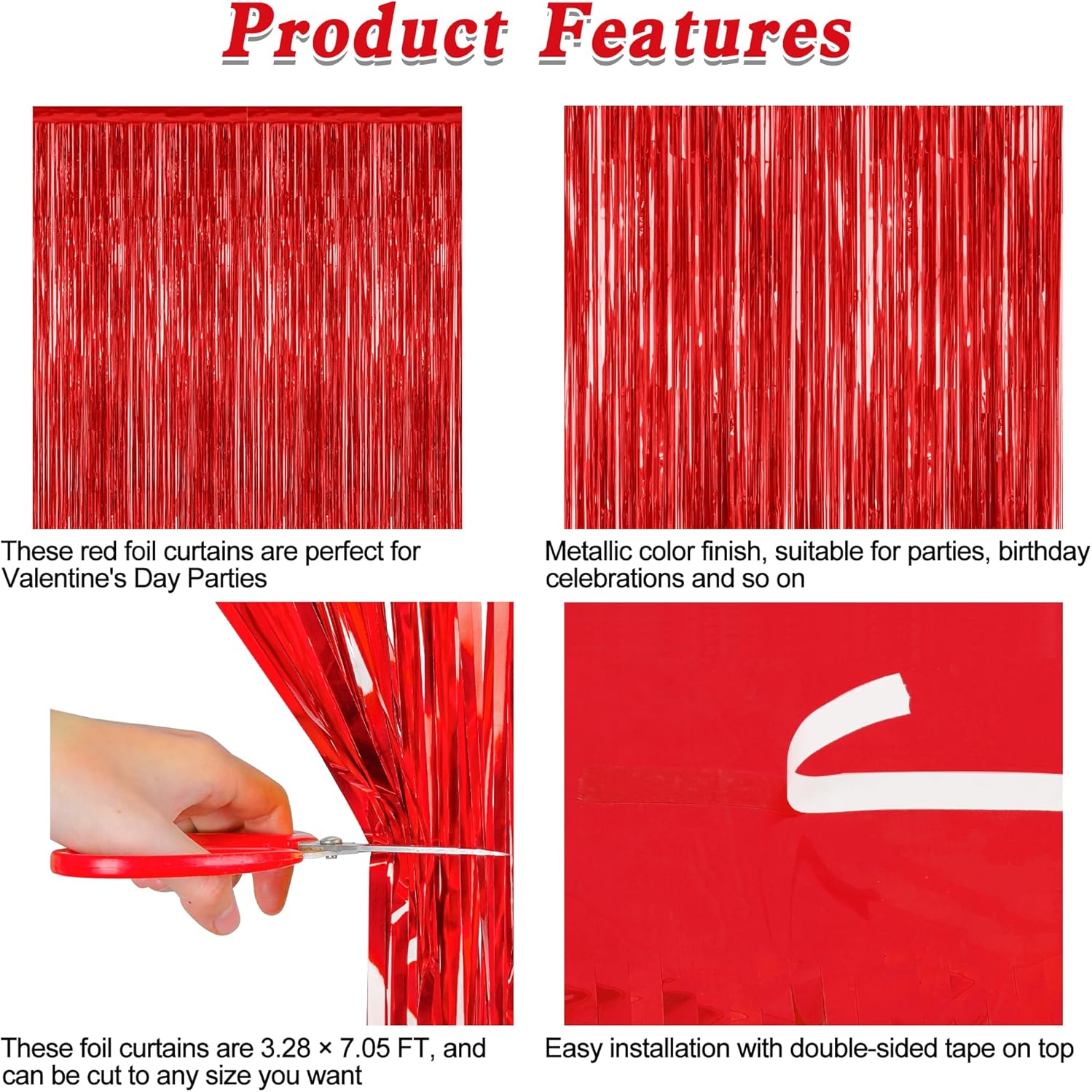 • Package Includes: The package includes 12 pcs red foil curtains, each with dimensions of 3.28 FT x 7.05 FT. These red foil fringe curtains can be trimmed to fit any specific area.