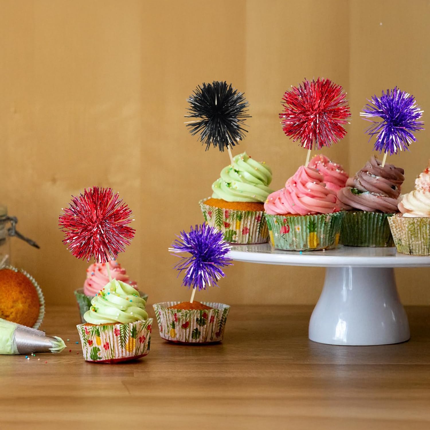 • -Premium Material: These Foil Firework Cupcake Toppers are made of high quality foil and food-grade toothpick, very safe to put them on cakes, cupcakes, ice cream, fruits, pie, dessert, cheese or any dish and food appetizer you want to decorate.