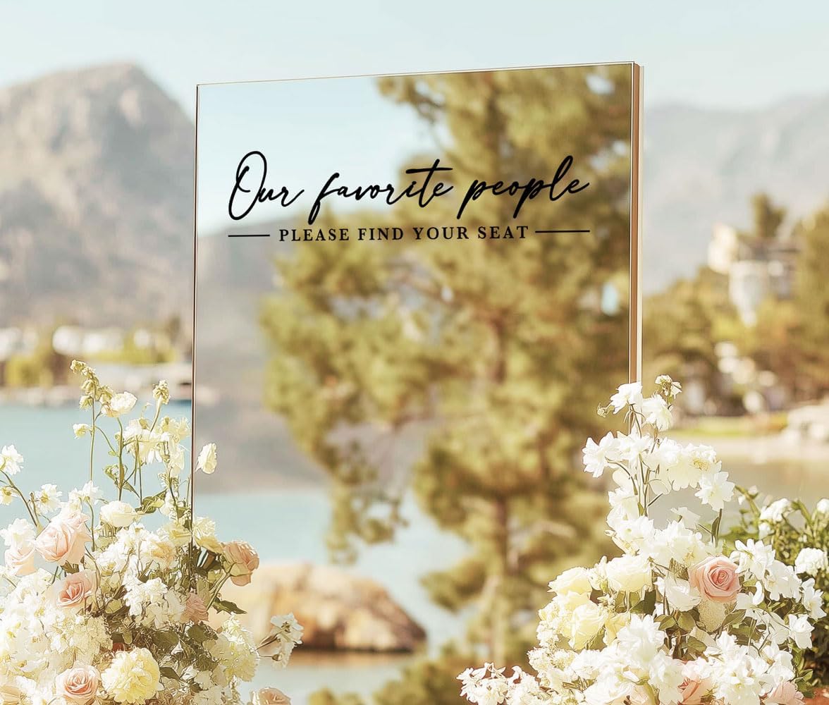 • "Our Favorite People, Please Find Your Seat" Elegant Calligraphy Header - Transform any mirror into a stunning seating chart with our beautifully scripted vinyl decal. The romantic calligraphy font adds a touch of wedding-day sophistication while helping guests easily locate their seats.