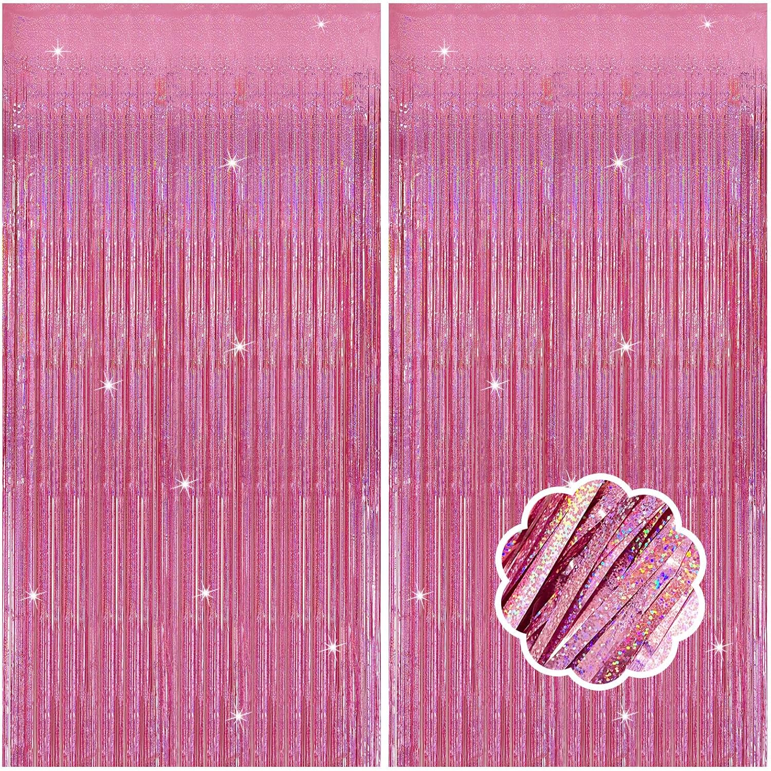 • Pink Fringe backdrop Set (2-Pack): Each dazzling curtain measures 3.28ft x 6.56ft โ€“ perfect for doors, walls, or photo booths! These extra-long foil streamers instantly transform any space into a party-ready celebration zone. Mix, layer, and customize your decor for the best results.