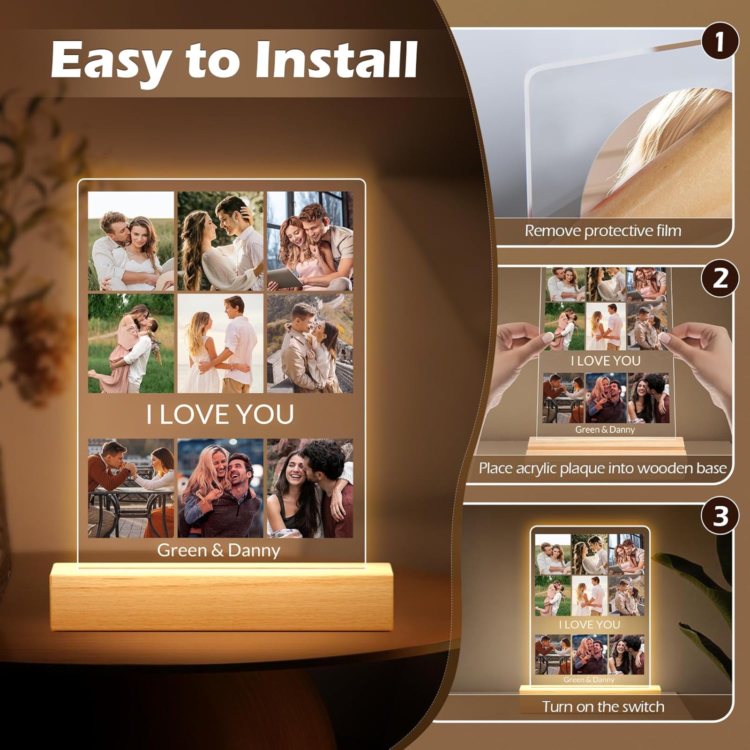 • Personalized Photo Frame with Night Light: Simply upload your favorite photos and add custom text to create a unique acrylic photo plaque with an integrated night light. This artistic display beautifully showcases your precious memories, adding a touch of romance and meaning to any space.