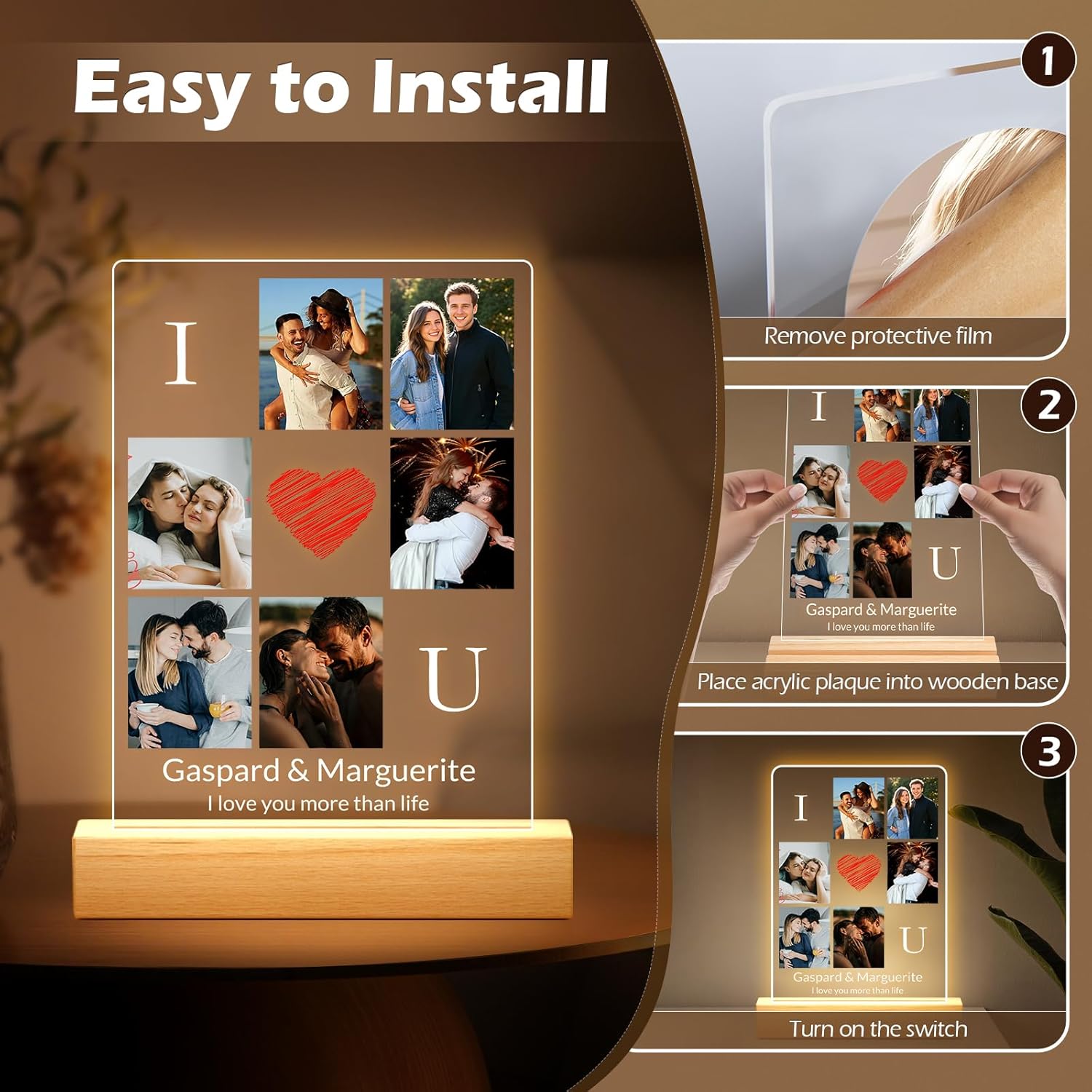 • Personalized Photo Frame with Night Light: Simply upload your favorite photos and add custom text to create a unique acrylic photo plaque with an integrated night light. This artistic display beautifully showcases your precious memories, adding a touch of romance and meaning to any space.