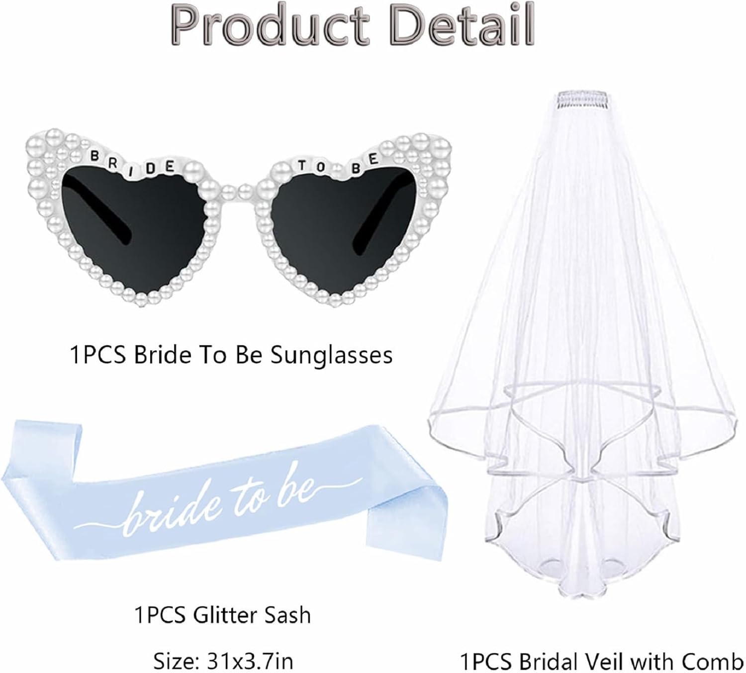 • 【Bachelorette Party Favors】You will receive: 1 x heart pearl "BRIDE TO BE" sunglasses, 1x blue "Bride to Be" satin sash, 1x layer veil. This bridal shower set will be the most beautiful accessory for bride to be and the most thoughtful gift for her