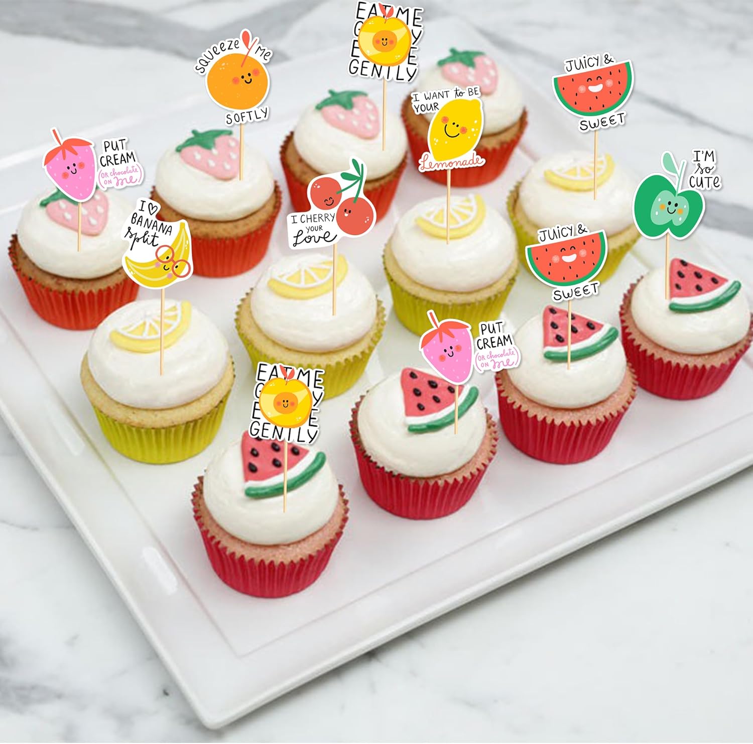 • These fruit cupcake toppers designed for single-sided, the backside is plain white, are not edible and intended for decoration only, please do not put these cupcake toppers into oven or microwave.