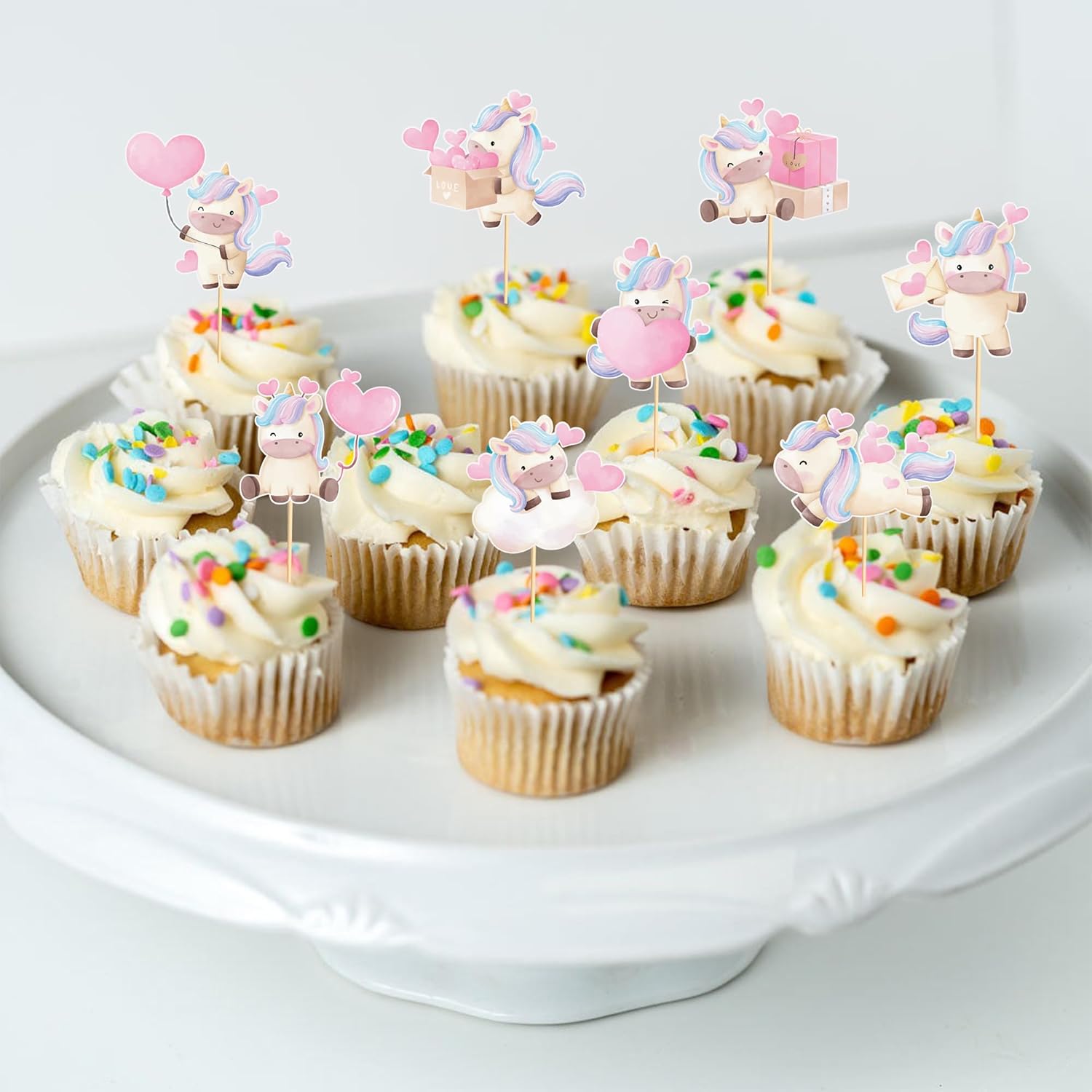24pcs Unicorn Cupcake Toppers with Heart Unicorn Party Decoration Suitable for Baby Shower Valentine's Day Birthday Party Decoration