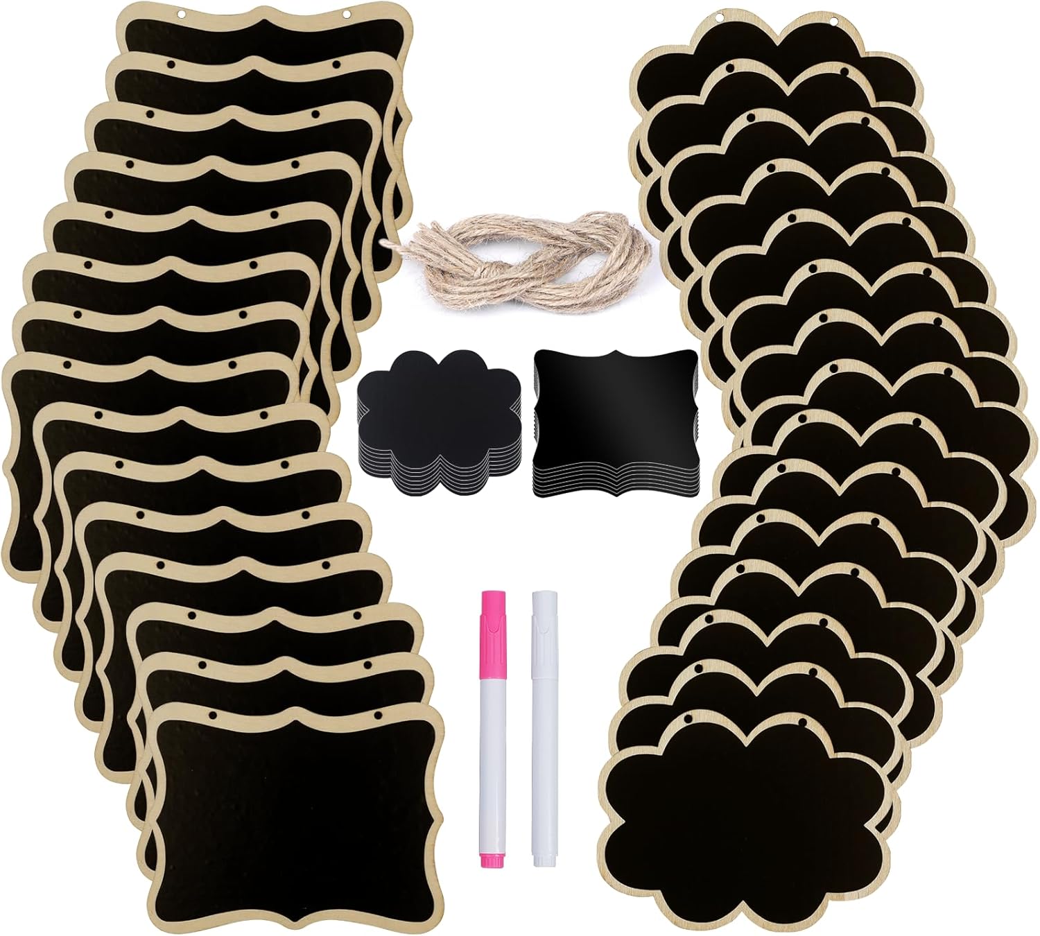 • 24-Pack Set: Complete starter kit includes 24 small chalkboard signs with strings in 2 styles, 2 liquid chalk markers in white and pink, and 10 replacement stickers. Everything you need to label food, price items, or create displays right out of the box