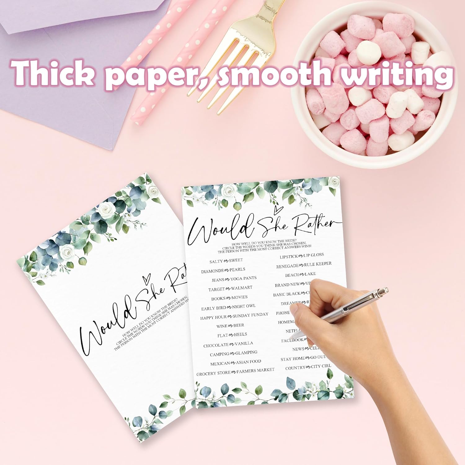 • 【Size】Perfectly proportioned at 5×7 inches, each card offers a thoughtfully arranged layout with generous writing space. The elegant design provides ample room for guests to express their most creative responses.