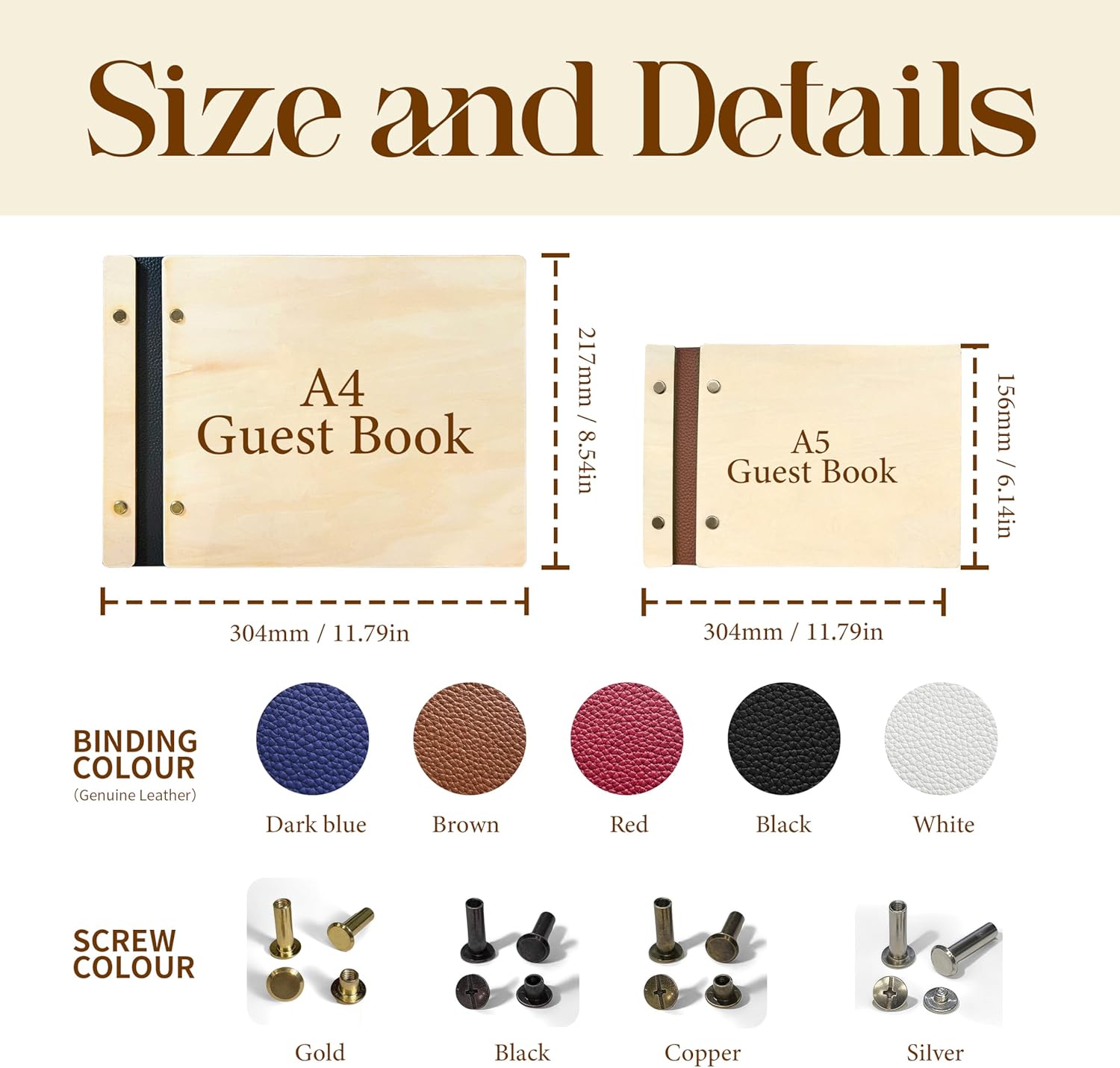 • Beautiful & High-Quality Cover - The Wooden Guestbook Cover is made of high quality genuine leather which can be freely matched with customization options. With a wood cover that is 3.5โ€“4 millimetres thick and sturdy metal spiral binding, this sign-in book provides a flat and secure writing surface, ensuring an effortless experience for all your guests.