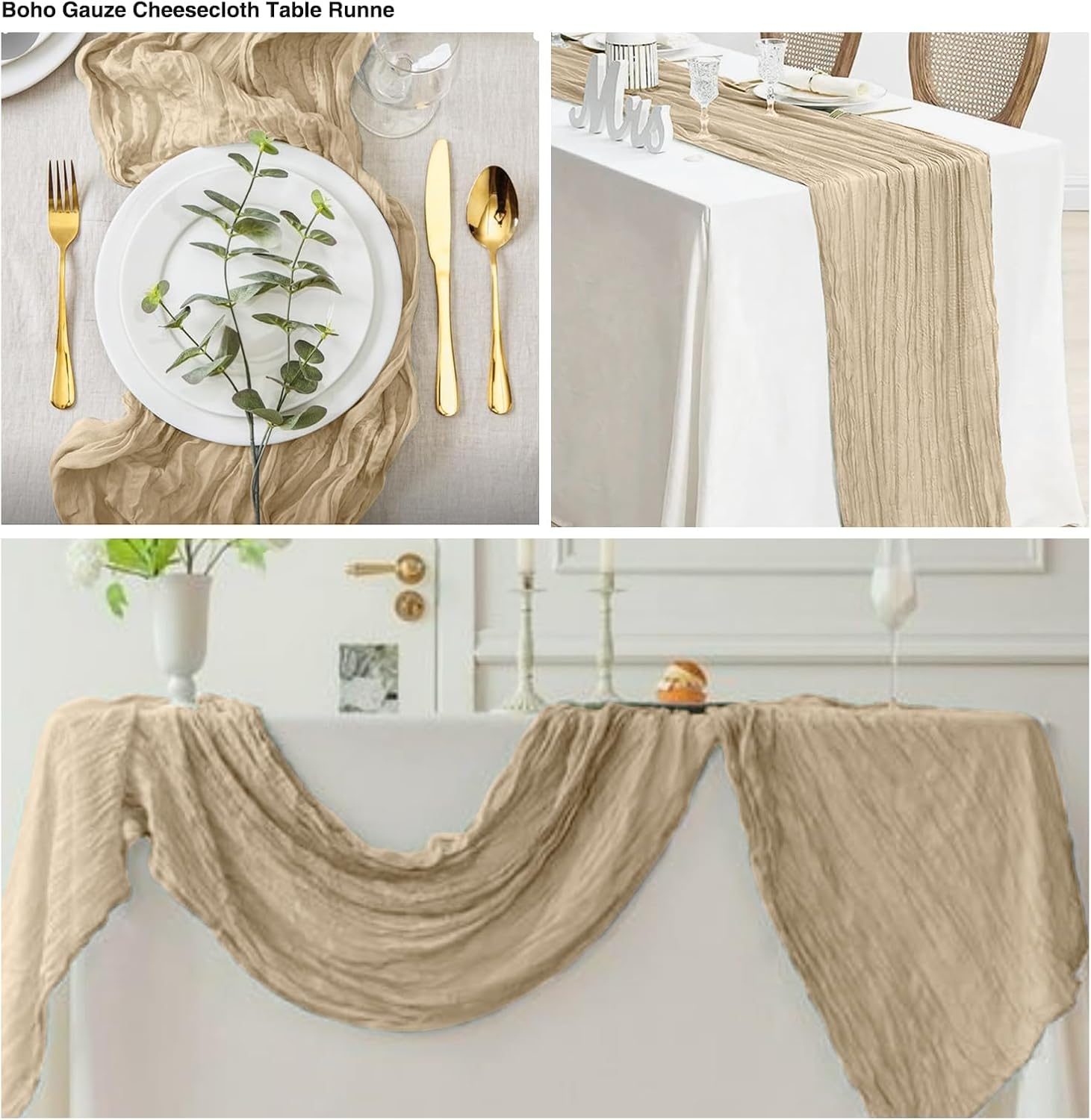 12 Pack Beige 10 Ft Cheesecloth Table Runner 20x121 Inch Boho Wrinkled Sheer Romantic Gauze Decor for Wedding, Bridal Shower, Birthday Party
