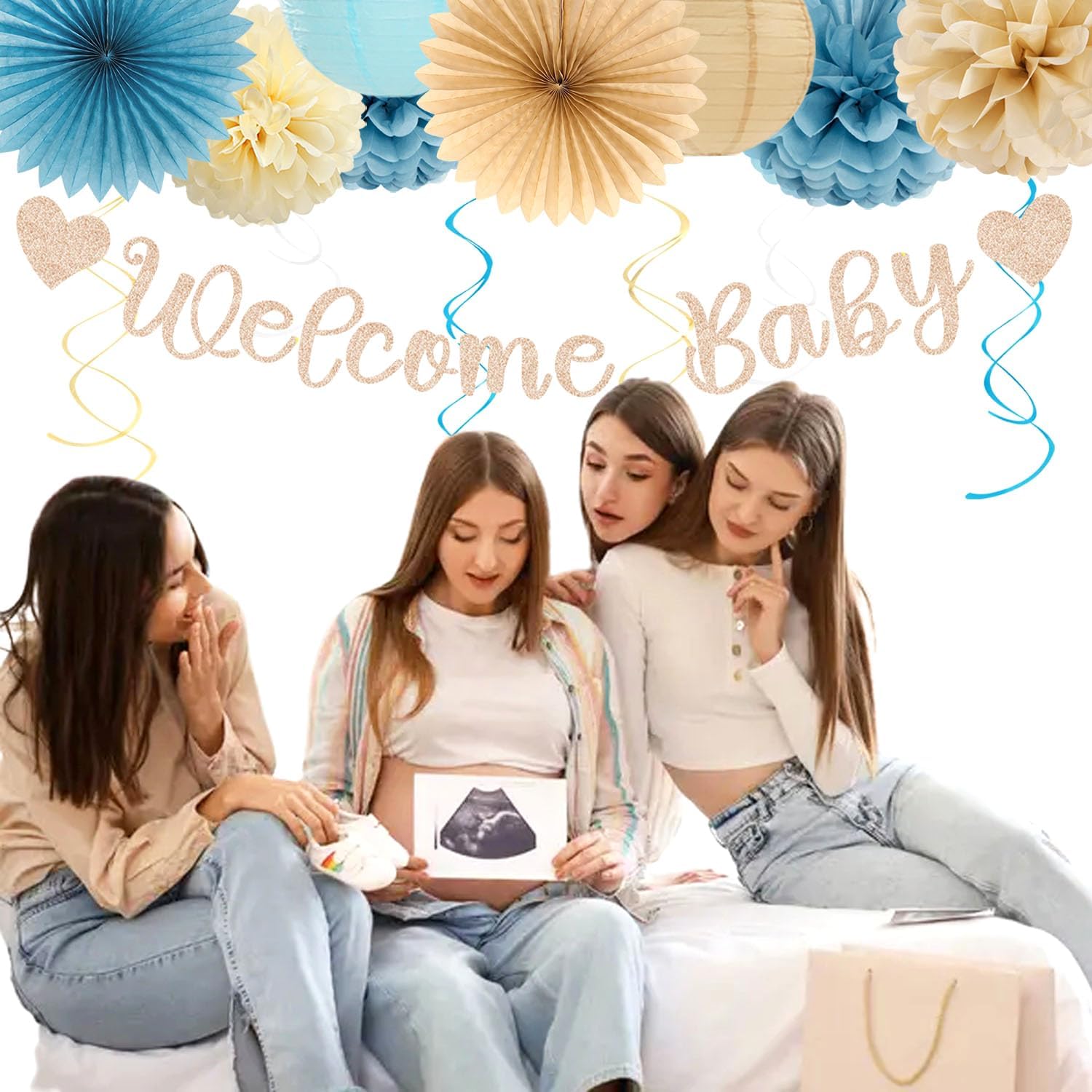 • 【Package Content】 Light dusty blue beige champagne baby shower party decorations contains: 1 pcs welcome baby streamers banner sign, 1 pcs circle dots paper banner, 2 pcs paper lanterns, 4 pcs tissue paper pom poms, 2 pcs paper fans, 6 paper swirls and 15 pcs tassel garland, total 31 pcs in 8 10 12 inch and blue beige champagne color.