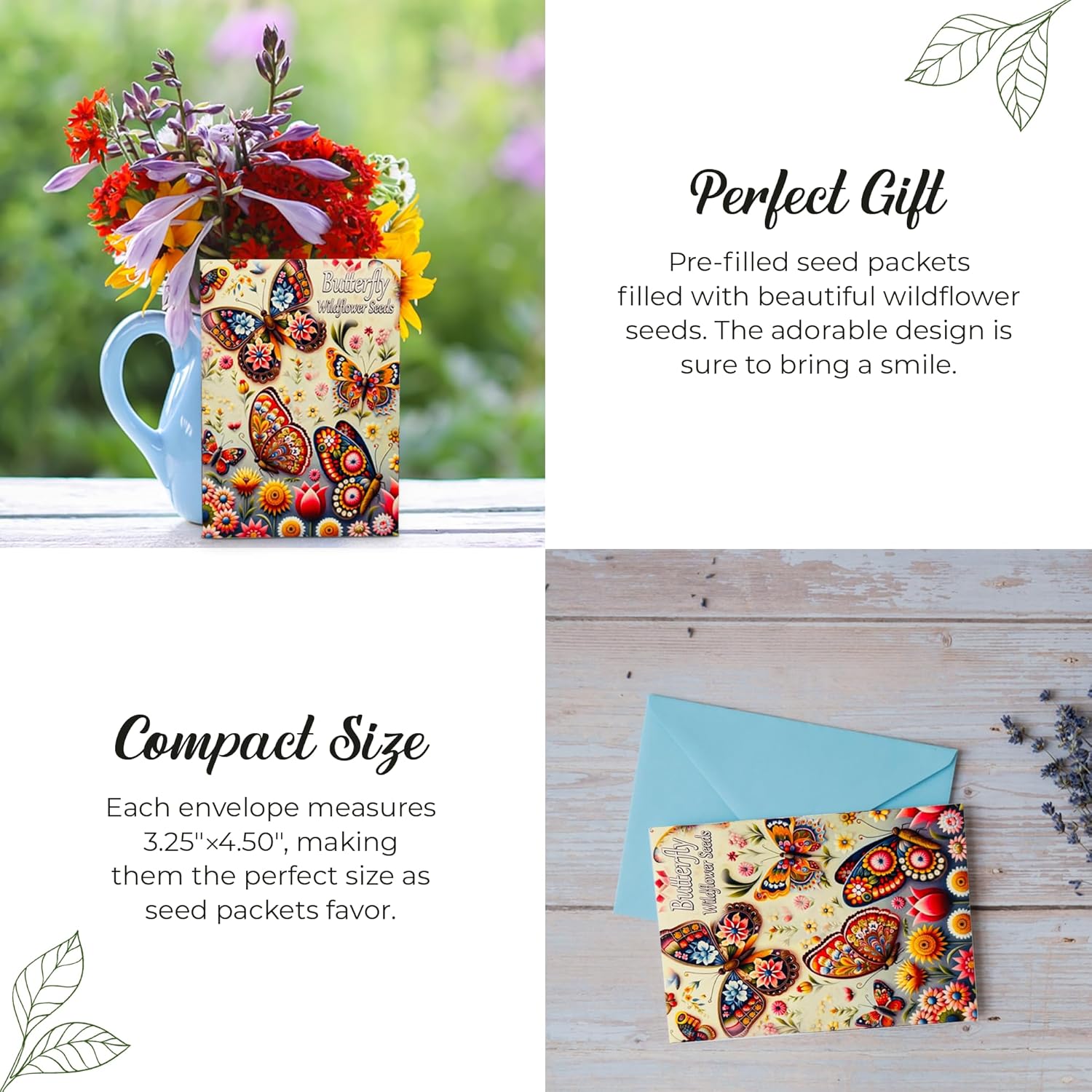 • LIGHTWEIGHT WILDFLOWER MIX SEED PACKETS: These Humming Birds, Butterflies and Bees-friendly wildflower seed packets measure a compact 3.25" wide x 4.50" high, both sturdy and lightweight Weighing only 2.39 ounces. The sharp glossy laminate not only catches the eyes of your guests but also ensures durability. Made for great table centerpieces or decorations, adding charm to any event or theme