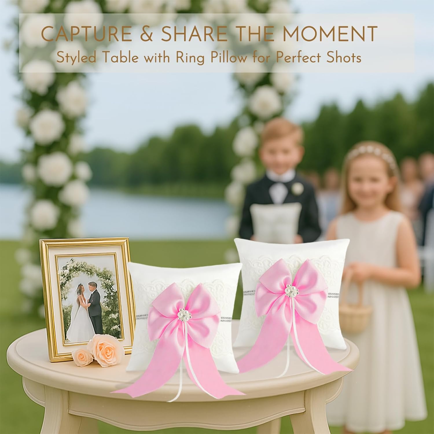Wedding Ring Bearer Pillow: 8.2 x 8.2 Inch Ivory Satin Lace Cushion with Pink Pearl Bow for Ceremony Vows - Secure Ring Holder for Flower Boy or Girl (Pink – 2 Pack)