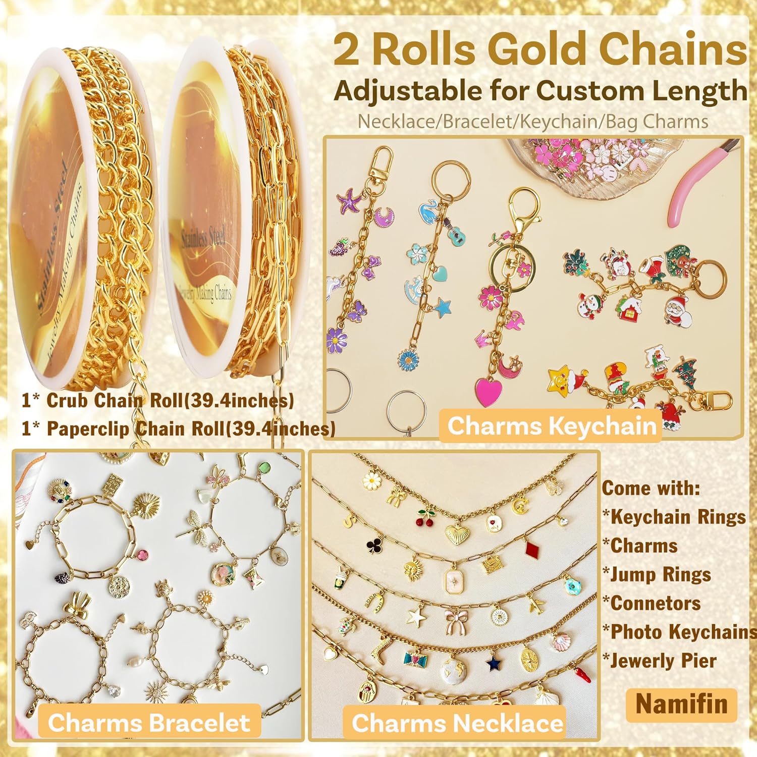 • COMPLETE 384 PCS DIY KEYCHAIN KIT โ€“ Includes 112 gold charms (letters, flowers, fruit), 30 keychain clips in 3 styles with rings, 30 lobster clasps, 200 jump rings in 3 sizes (6/7/8mm), 2 rolls of extender chains (65.6 ft total), 1 pink jewelry plier, and 6 photo keychains โ€“ all the essentials for creative crafting