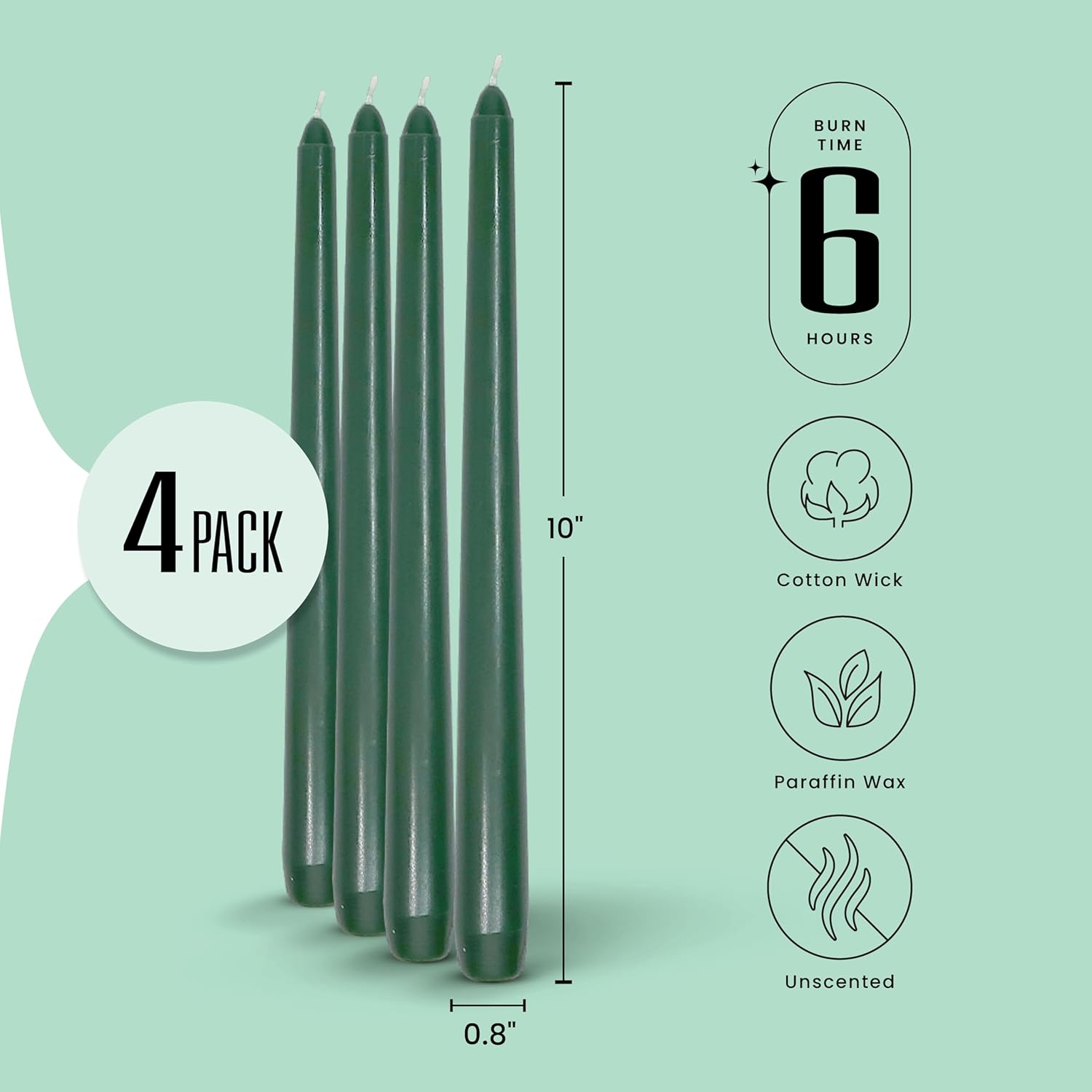 • Long-Burning Green Tapered Candles – Each 10” taper burns up to 6 hours unscented, providing steady light for Christmas tables, Easter brunches, or daily family dinners where dark green candle sticks add a touch of nature-inspired beauty.
