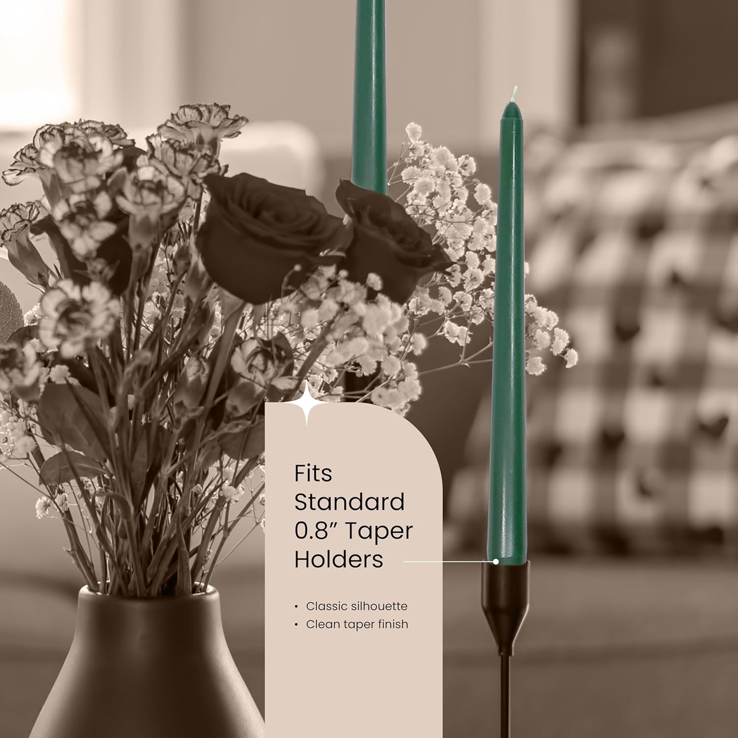 • Classic Base for Secure Fit – Designed with a tapered 0.8” base, each green candle stick fit most standard candlesticks, making them reliable for dining tables, mantels, or outdoor patio centerpieces.