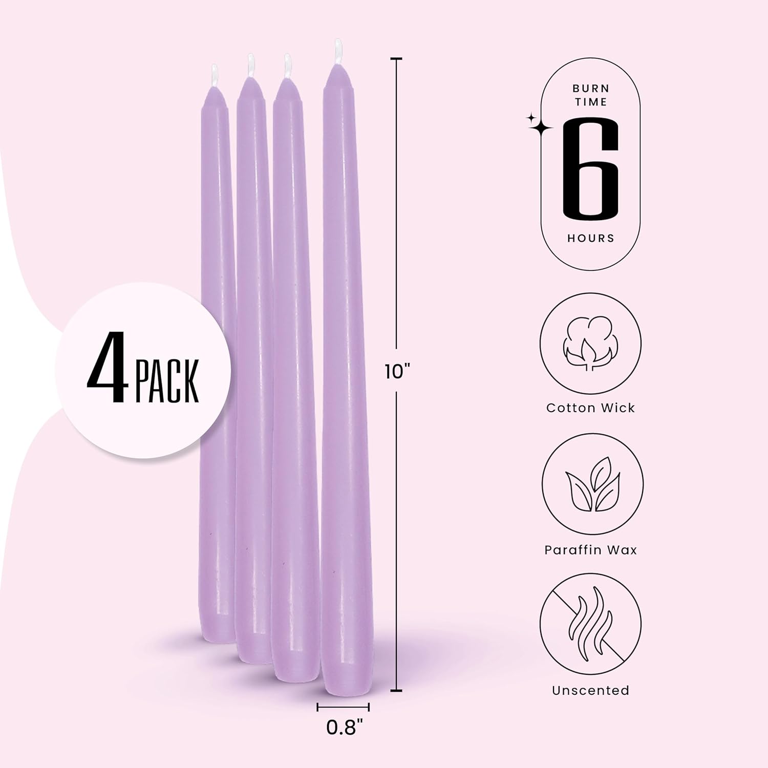 • Long-Burning Light Purple Candles – Each 10” taper burns up to 6 hours unscented, offering gentle light for Easter brunches, spring weddings, or everyday dining where pastel candlesticks create a soft, elegant glow.