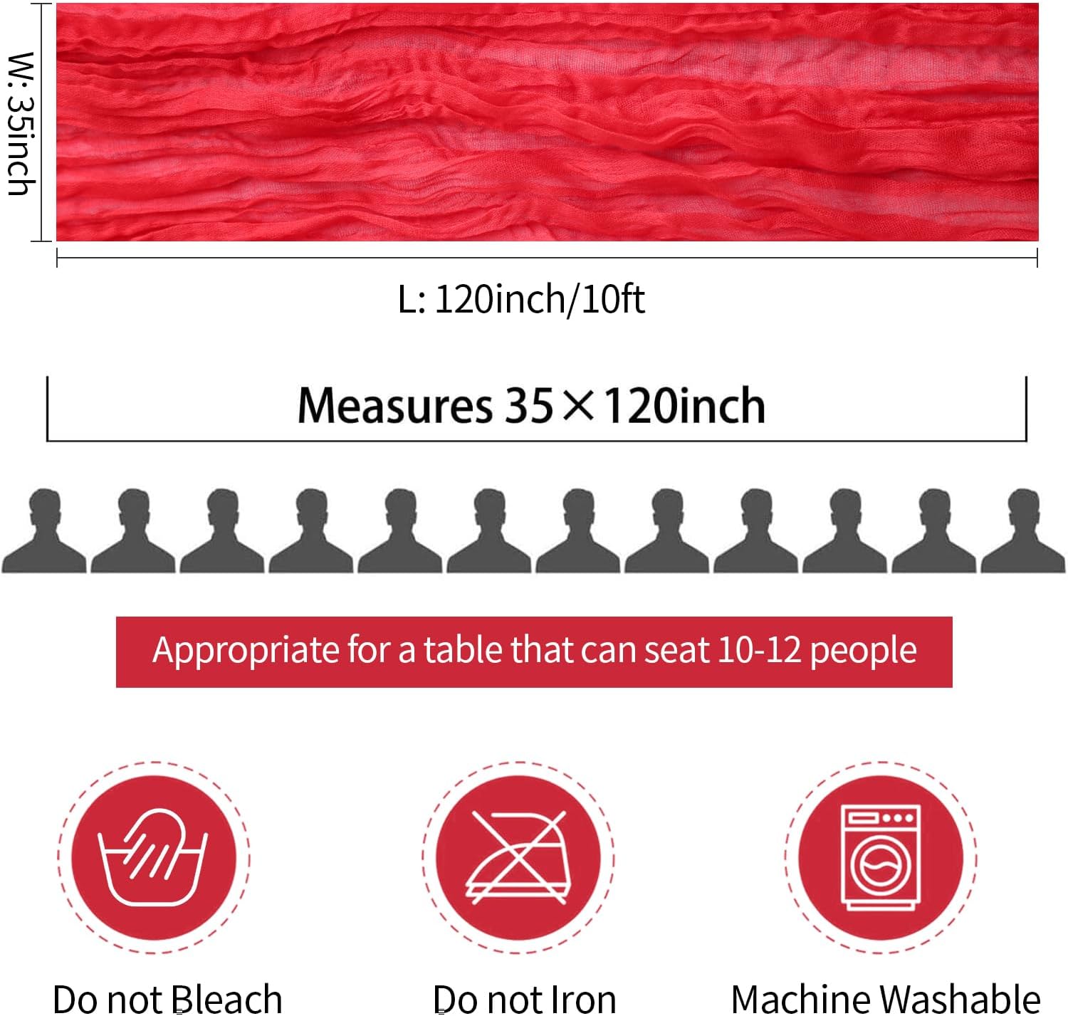 • 🍎【Vintage Red Table Runners】You will get 3 pieces 10ft length red cheesecloth table runners, enough quantity is suitable for wedding banquets and various parties, the size of each red gauze table runner is approximately 35 x 120 inches / 90 x 300 cm, which is large enough to cover rectangle and round tables, can also be spliced together for long tables. Even can also cut it yourself for DIY chair cover sashes or decorative napkins, backdrop draping or even gift wrapping.