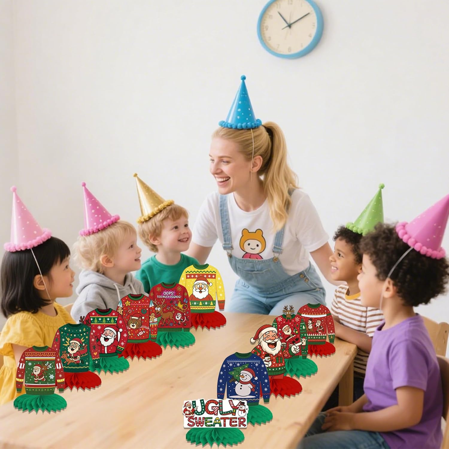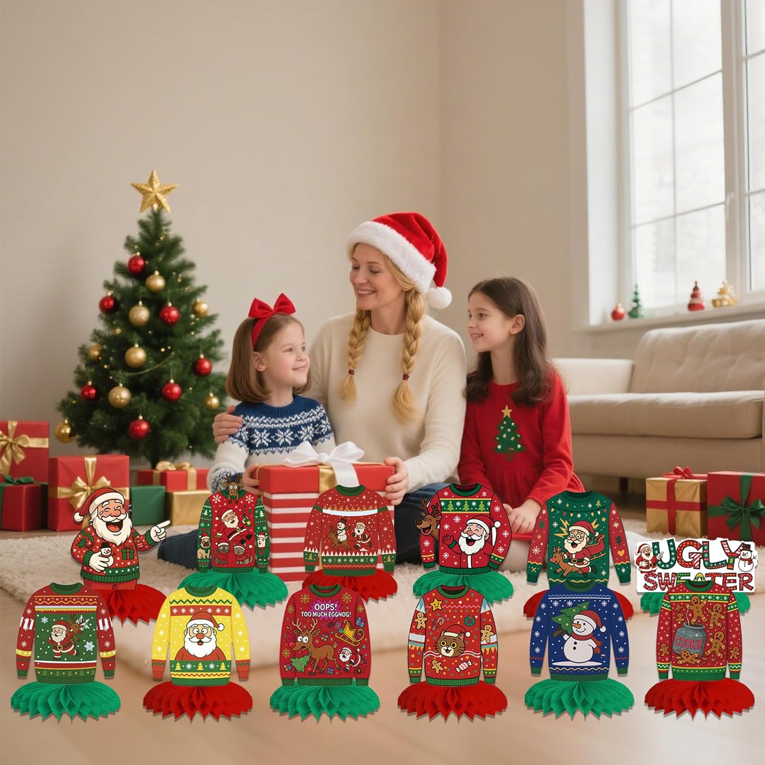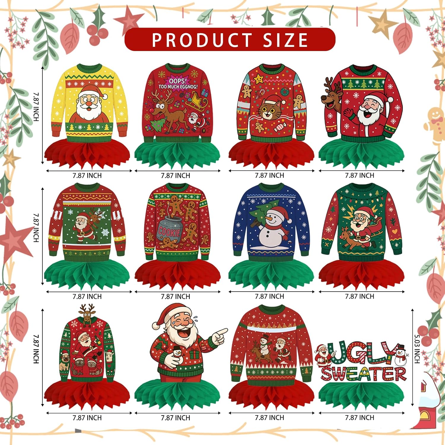 • Ugly Sweater Party Decorations:Our Ugly Sweaters Honeycomb Centerpieces set includes 12 pack Christmas Party centerpieces, Contains various styles of ugly sweaters, with patterns featuring Christmas elements such as Santa Claus, reindeer, snowman, gingerbread man, etc.