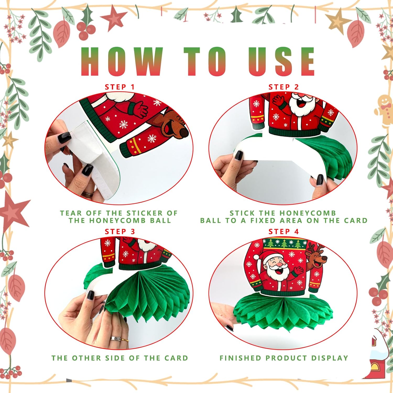 • Easy Assembly:These Christmas Ugly Sweater Party Decorations are pre folded and pre cut, you just need to unfold them, tear off the sticker of the sweater honeycomb balls, stick onto the card;The standing card can be easily inserted into the base, saving you valuable time when preparing for your event.