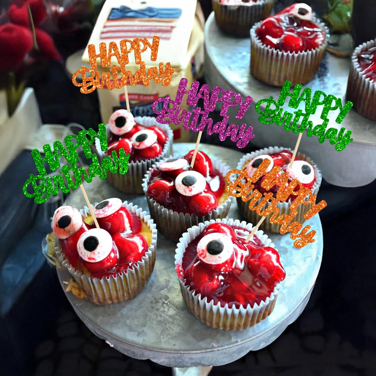 Gyufise 24Pcs Happy Birthday Cupcake Toppers Glitter Birthday Cupcake Food Picks for Celebrating Happy Halloween Theme Party Cake Decorations Supplies Orange Green Purple