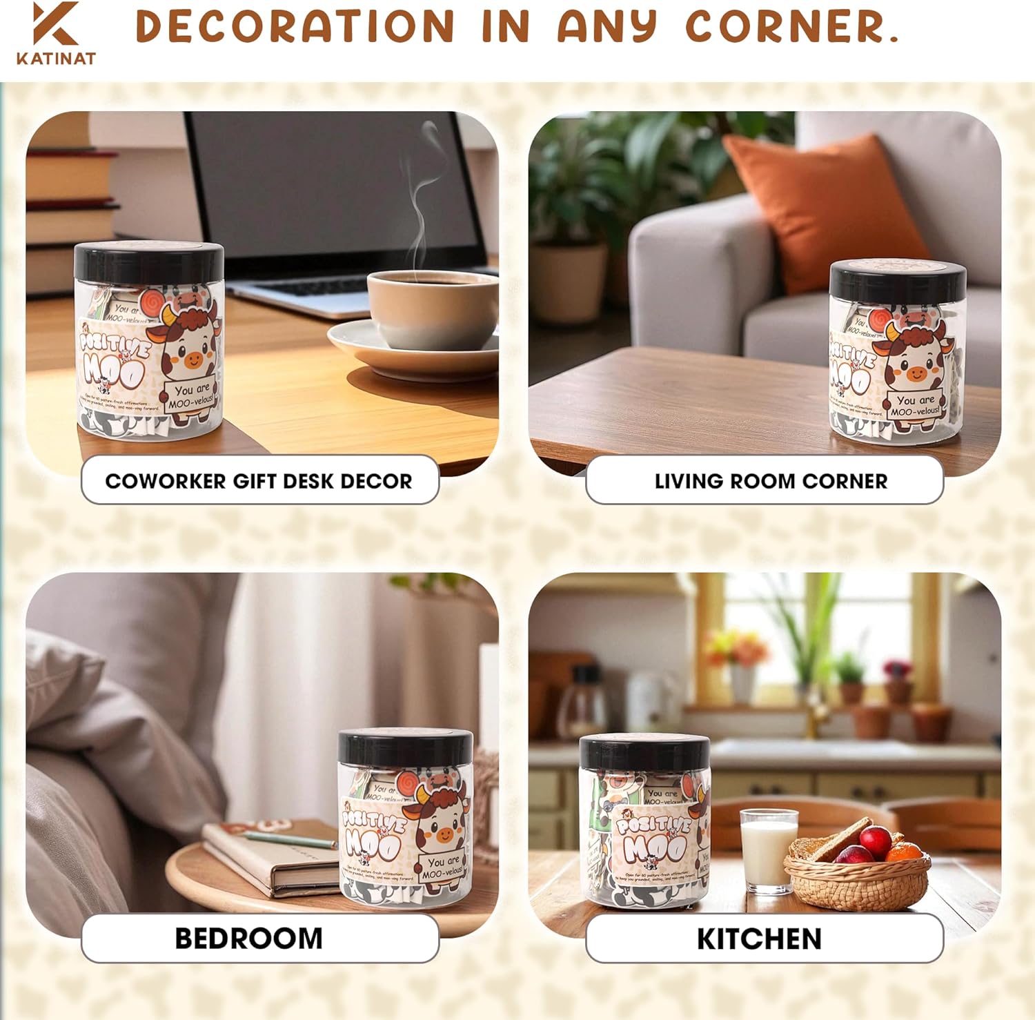 • 🐮 Adorable Cow Decor for Desk, Room, or Office Beyond the affirmations, this jar is designed with a stylish cow print label, making it a unique piece of cow desk decor. Place it on your work desk, study table, or living room shelf, and enjoy it as both cute cow decorations and a daily source of motivation.