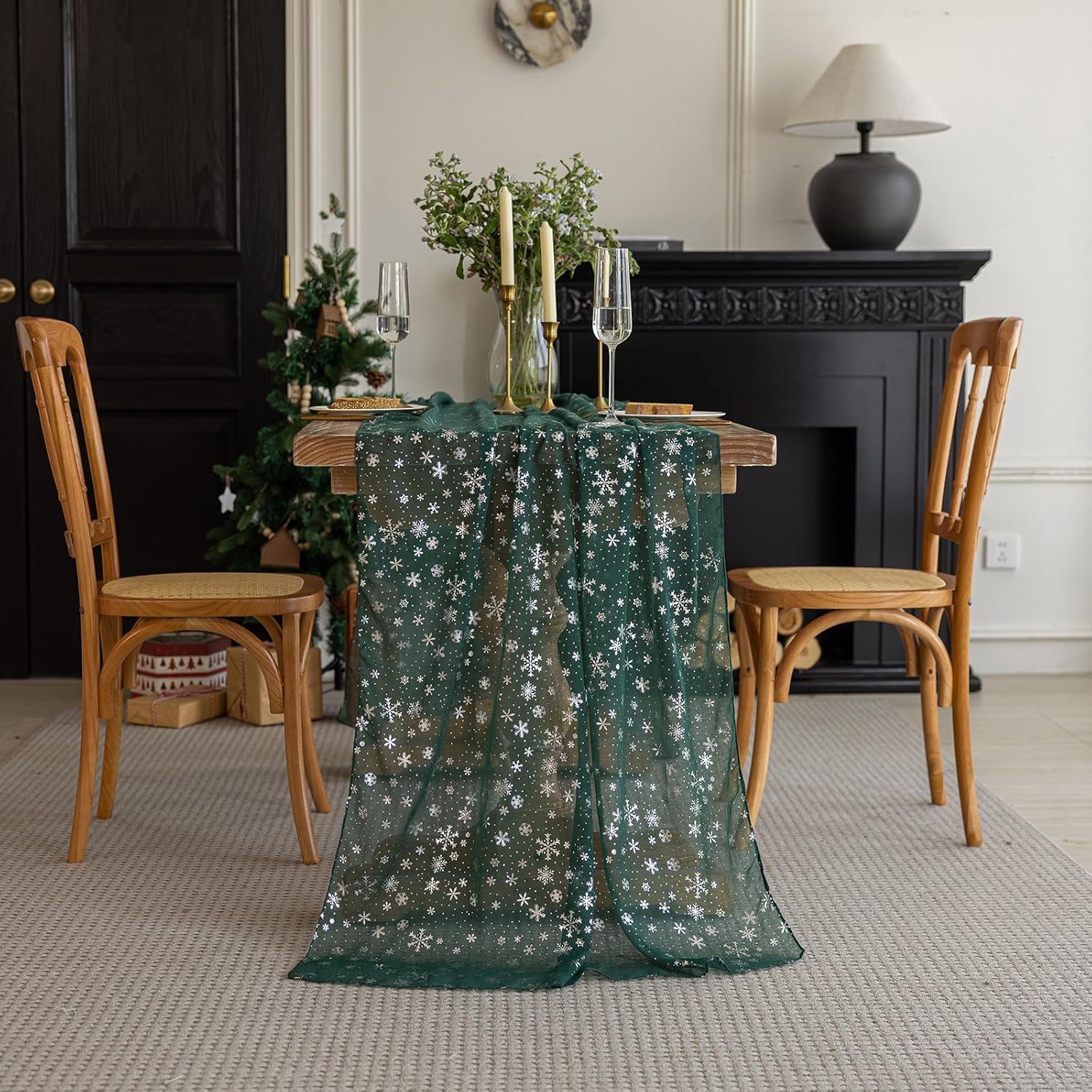 • Foil-Printed snowflakes shimmering metallic design catches the light beautifully.Versatile decor works for christmas, weddings, parties, and home styling.120" length fits standard dining tables with elegant drape . sheer tulle fabric lightweight yet durable, won’t wrinkle easily