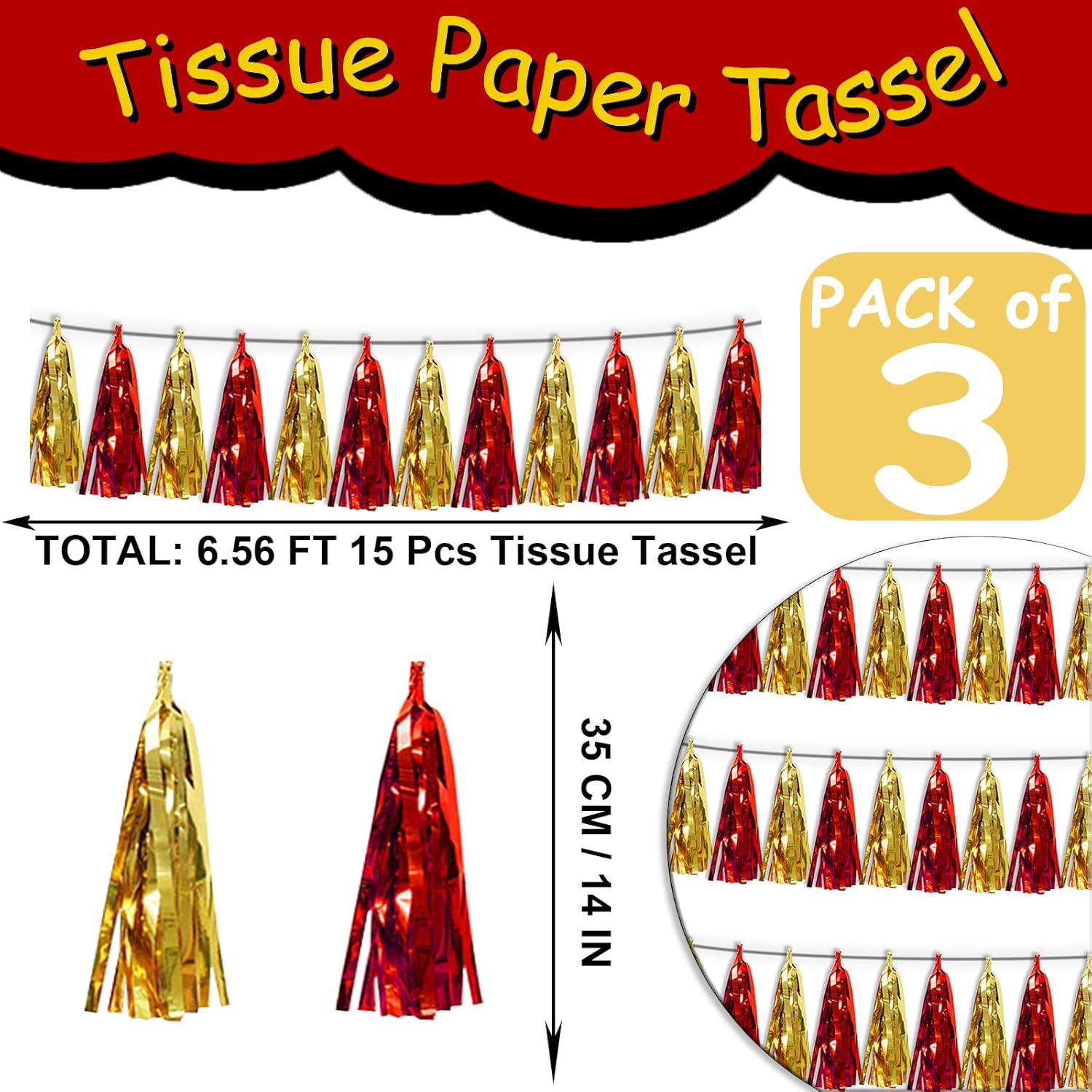 • 【Package Includes】The total length of the red gold birthday tassels banner is 30 feet, divided into 3 strips, each 10 feet long. Each banner contains 15 tassels, and each tassel measures 14 inches, for birthday decorations many occasions uitable for Patriotic display, omecoming Float, Christmas Float, ecorative metal trailers, graduation floats etc