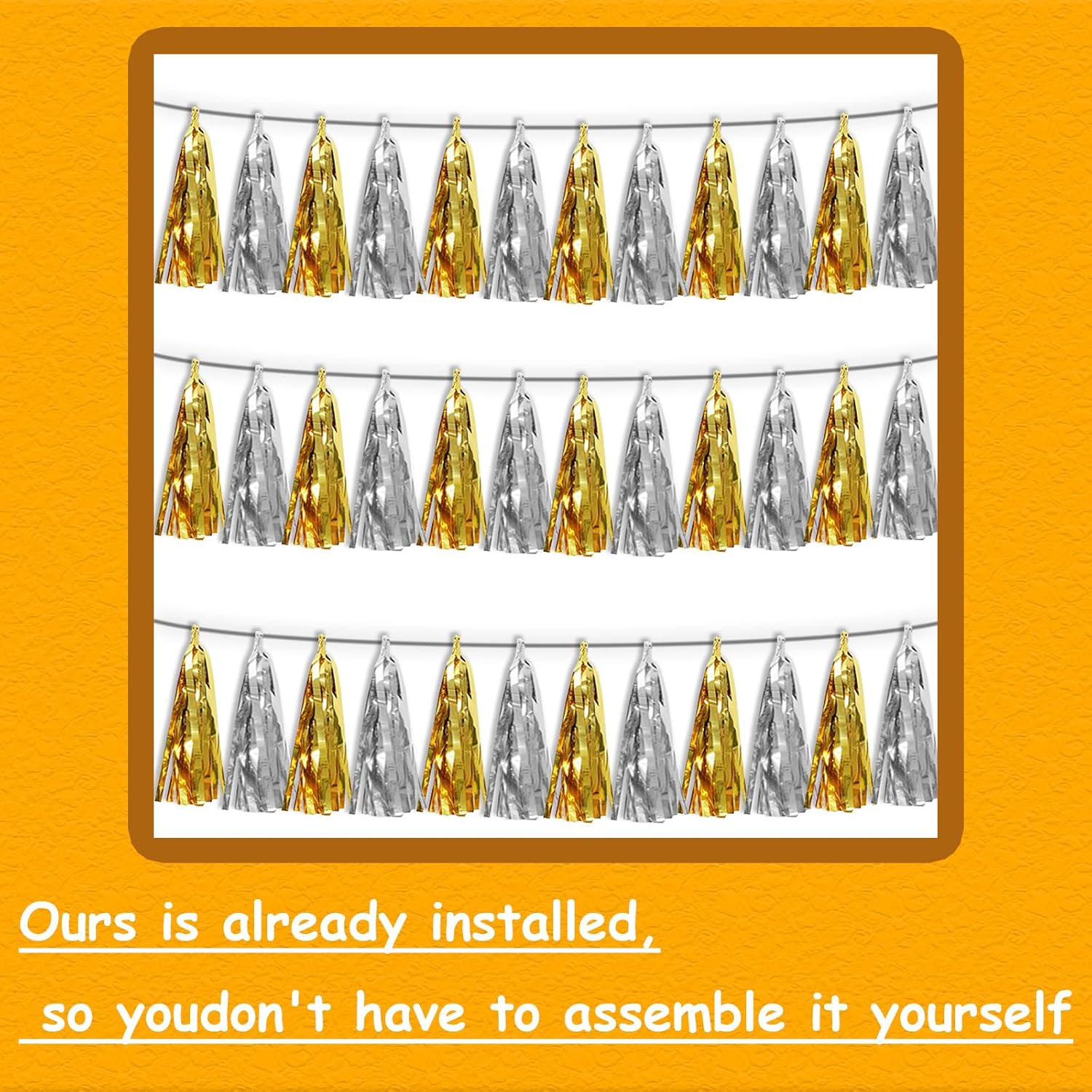 • 【Package Includes】The total length of them gold silver birthday tassels banner is 30 feet, divided into 3 strips, each 10 feet long. Each banner contains 15 tassels, and each tassel measures 14 inches, for birthday decorations many occasions uitable for Patriotic display, Homecoming Float, Christmas Float, ecorative metal trailers, graduation floats etc