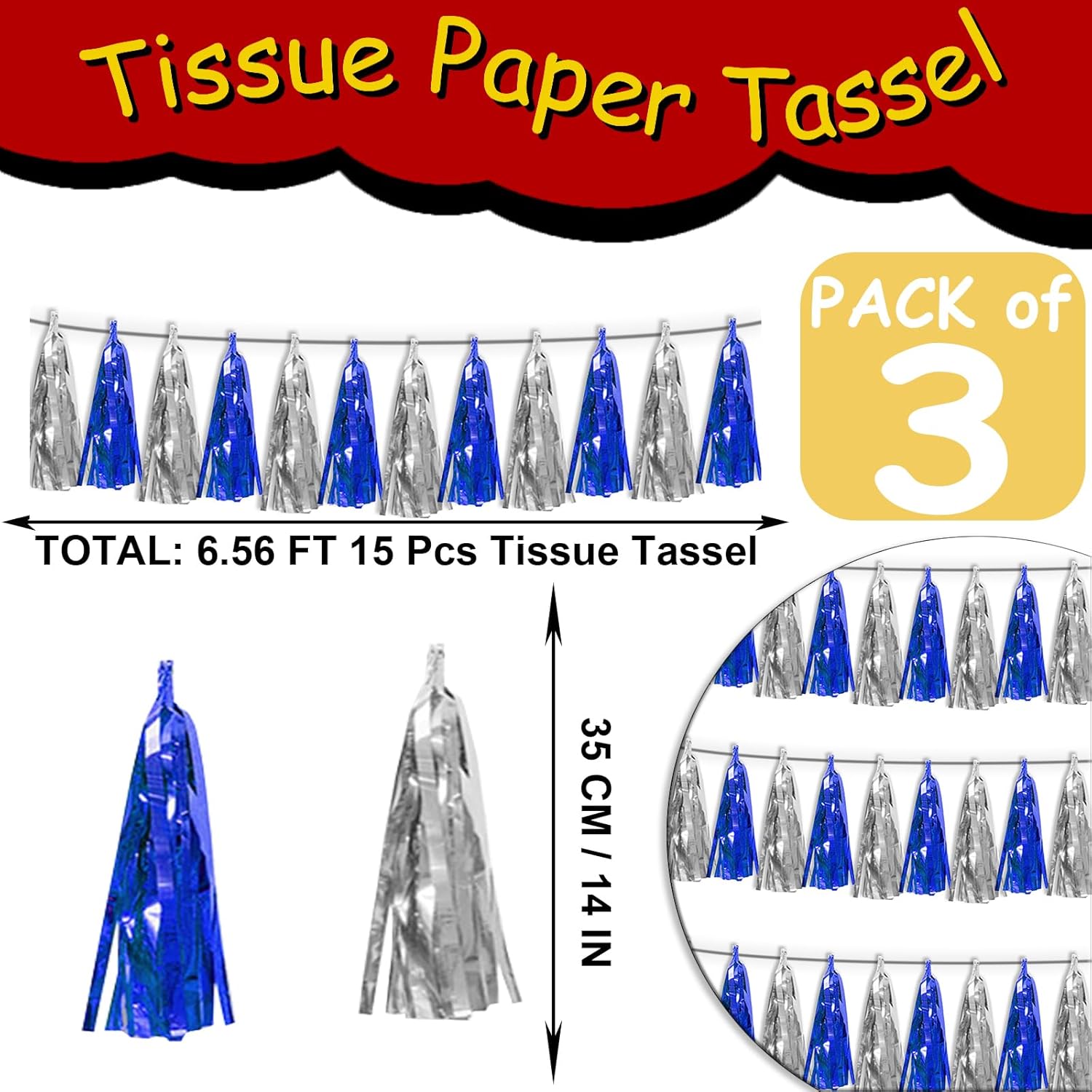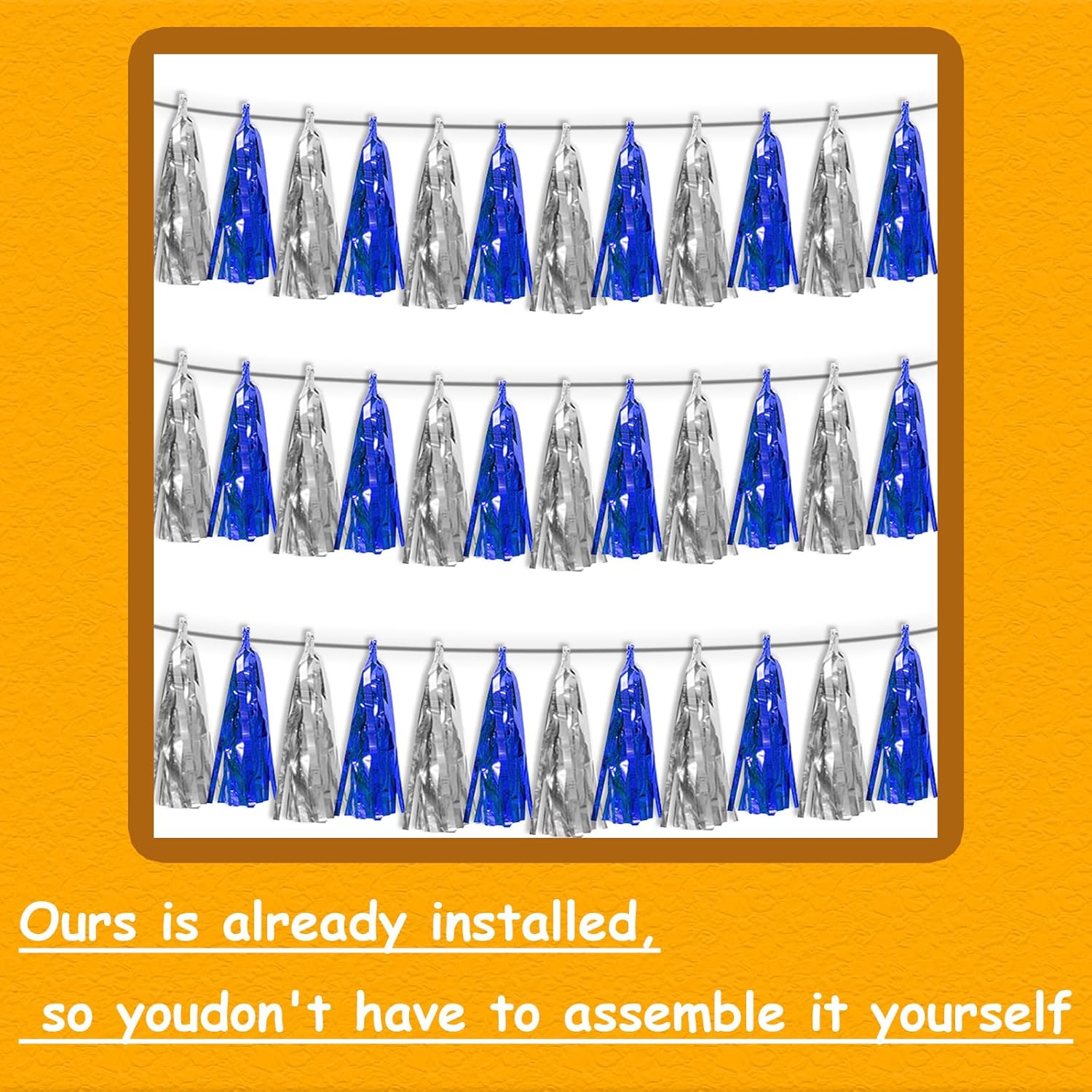 • 【Package Includes】The total length of the Navy-Blue Silver birthday tassels banner is 30 feet, divided into 3 strips, each 10 feet long. Each banner contains 15 tassels, and each tassel measures 14 inches, for birthday decorations many occasions uitable for Patriotic display, Homecoming Float, Christmas Float, ecorative metal trailers, graduation floats etc
