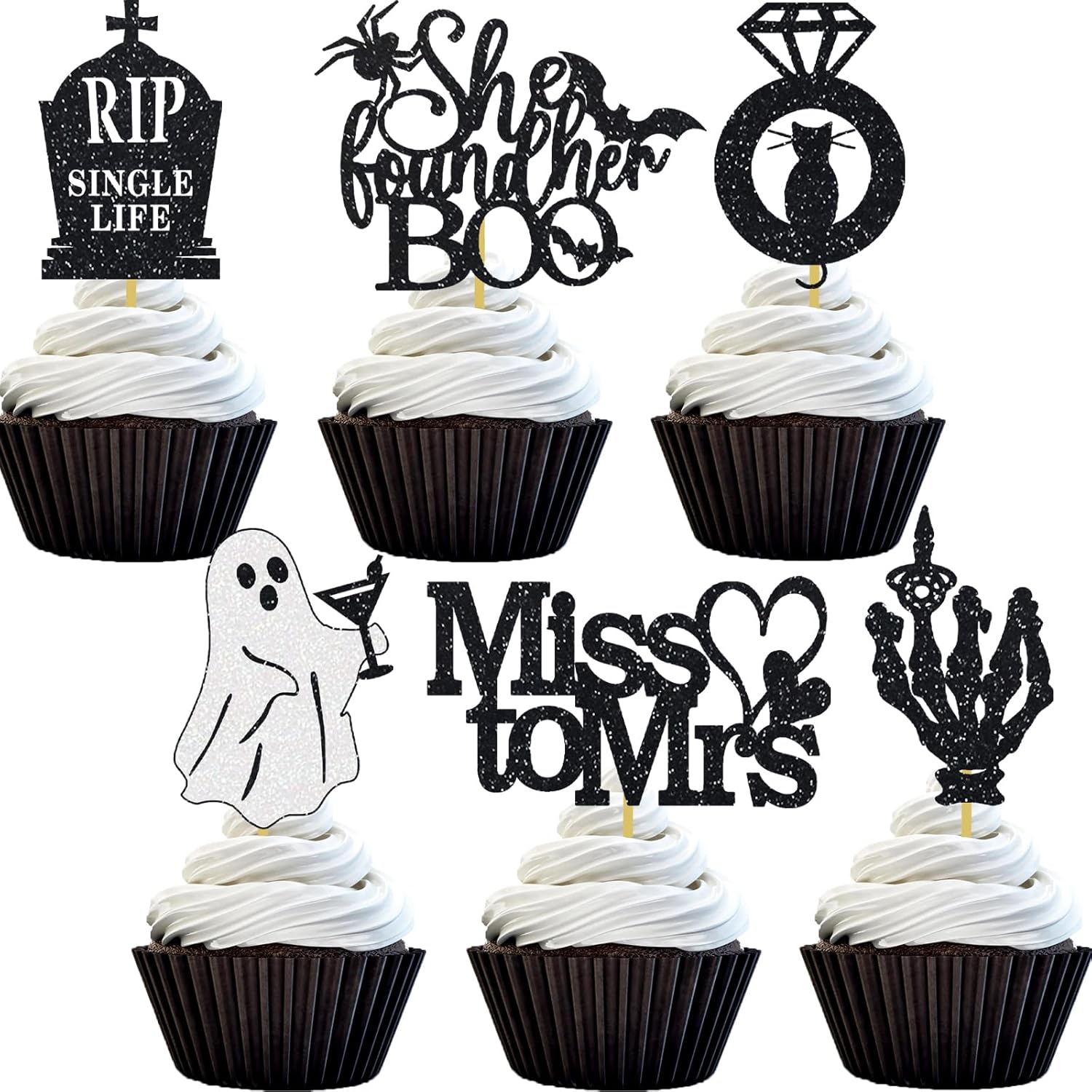 Halloween Bachelorette Cupcake Topper She Found Her Boo Rip Single Life Miss To Mrs Ring Cat Skull Finger Engagement Party Decorations White