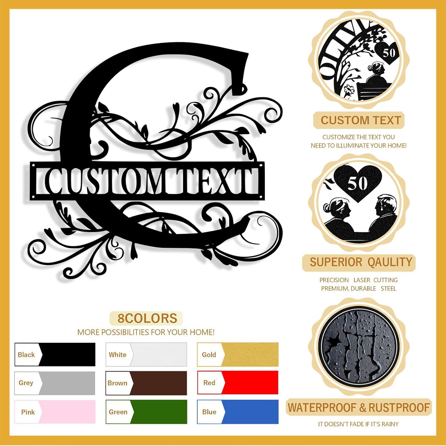 • Premium Quality Materials - Crafted from sturdy and durable steel, meticulously laser-cut for a precise shape and smooth, clean edges. These last name signs for home are built to last and finished with a weather-resistant powder coating that prevents fading, rust, and corrosion, ensuring lasting beauty both indoors and outdoors