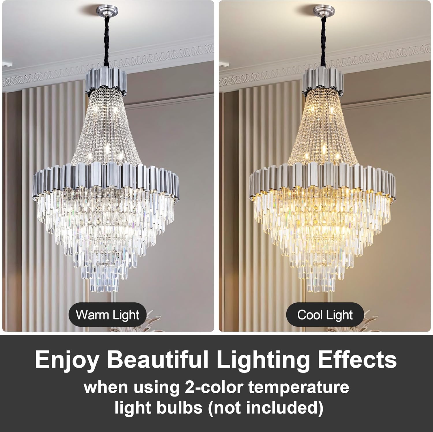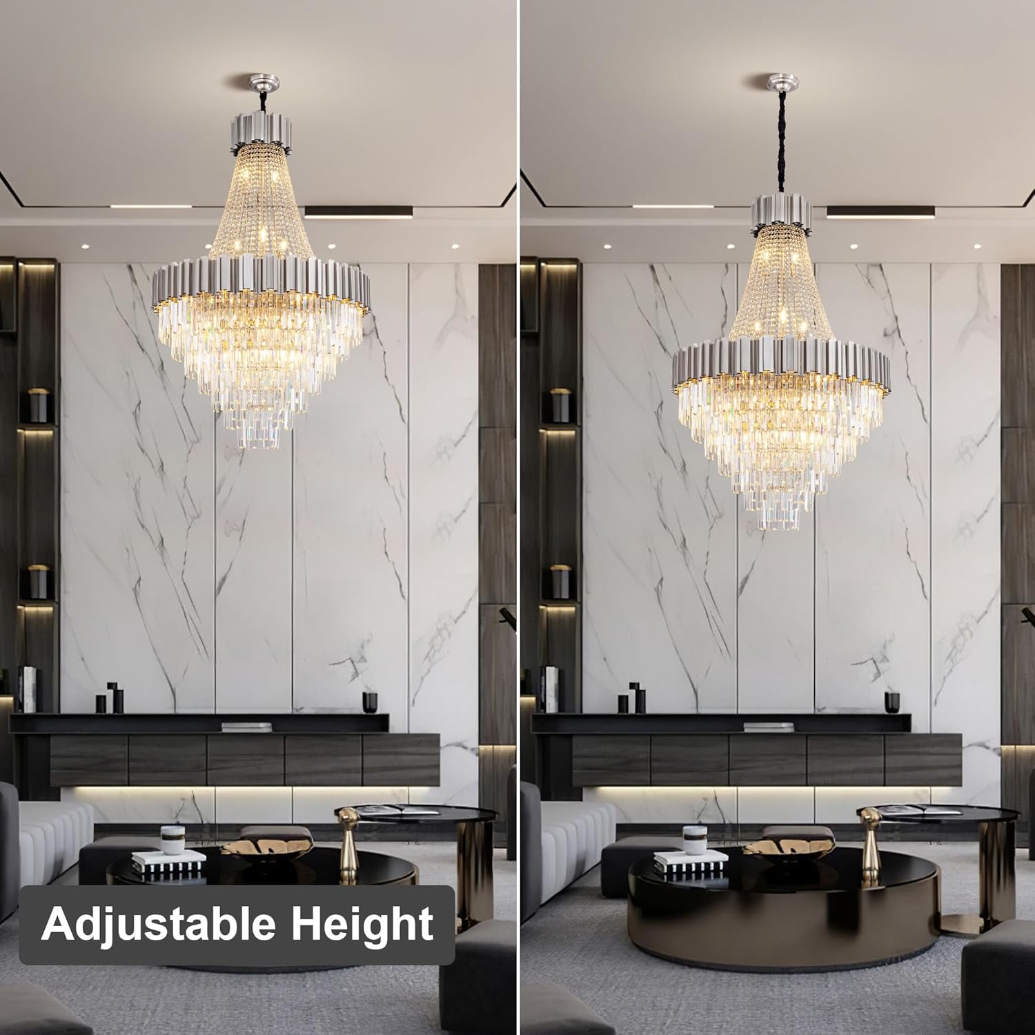 • 【Luxury High Ceiling Chandelier】This stunning modern chandelier is crafted with premium silver frame and 100% top K9 transparent crystals that exude a diamond-like brilliance. With 420 sparkling crystals adds brilliance and sophistication, each crystal refracts light beautifully, creating a dazzling, luxurious atmosphere for your home.