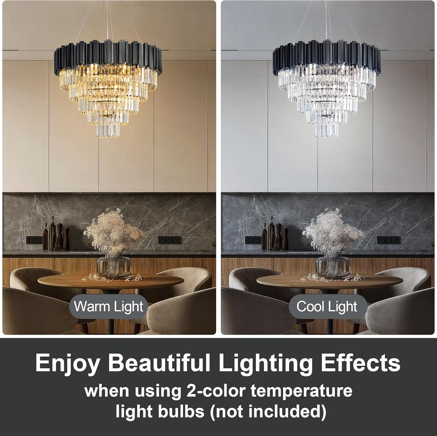 • 【Luxury Crystal Chandelier】This modern chandelier is crafted with premium matte black frame and 100% top K9 transparent crystals that exude a diamond-like brilliance. With 5 tiers and 228 sparkling crystals adds brilliance and sophistication, each crystal refracts light beautifully, creating a dazzling, luxurious atmosphere for your home.