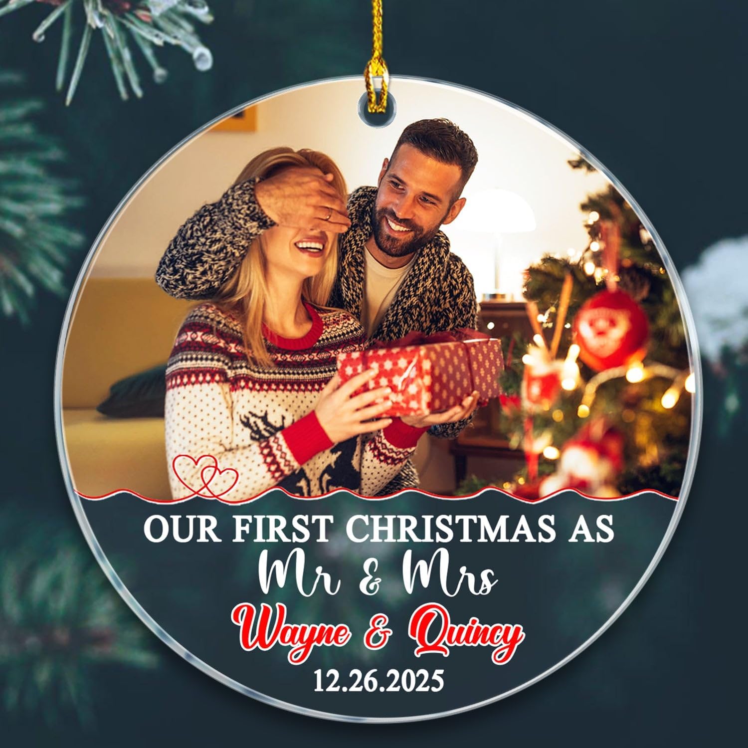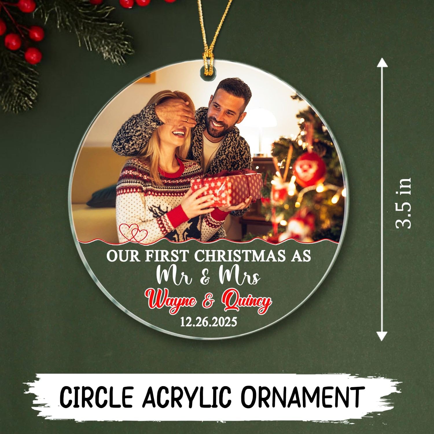 • VIBRANT PRINT & LASTING DESIGN: Printed using advanced sublimation, the Our First Christmas As Mr & Mrs design features edge-to-edge color that won’t fade easily. A glossy surface adds a festive shine, making this ornament a timeless piece that combines modern acrylic craftsmanship with traditional holiday style.